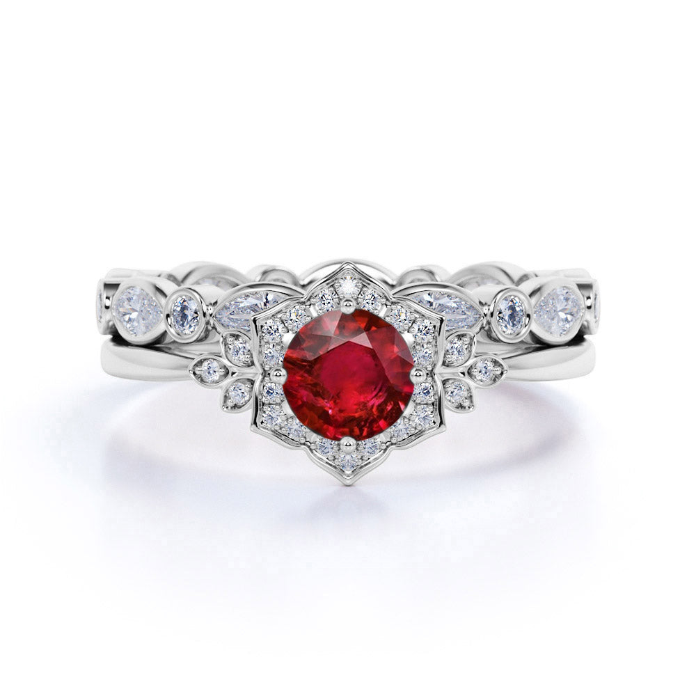 Vintage Floral Eternity 2.25 Carat Round Cut Lab Ruby and Diamond Halo Wedding Set with Art Deco Band in White Gold