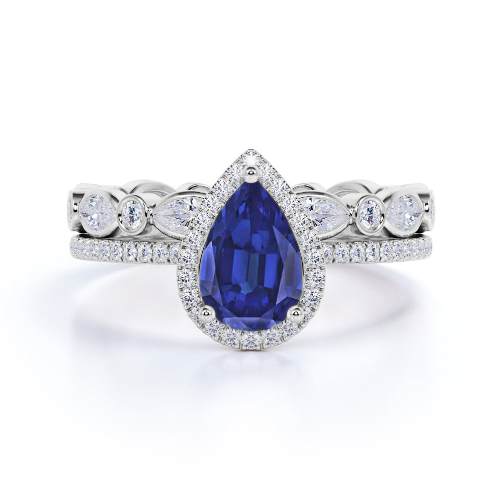 Vintage Pave Set 2.25 Carat Pear Cut Sapphire and Diamond Halo Wedding Set with Art Deco Eternity Band in White Gold