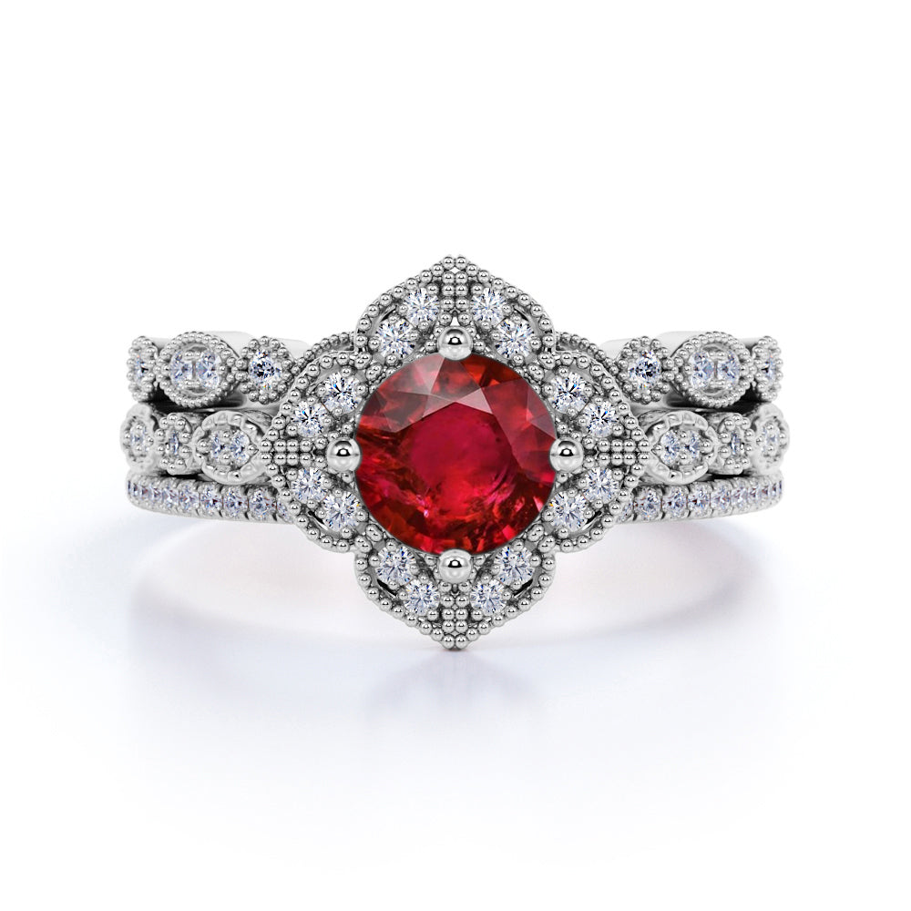 Floral Pave 2.25 Carat Round Cut Lab-Created Ruby and Diamond Halo Trio Wedding Set with Art Deco Bands in White Gold
