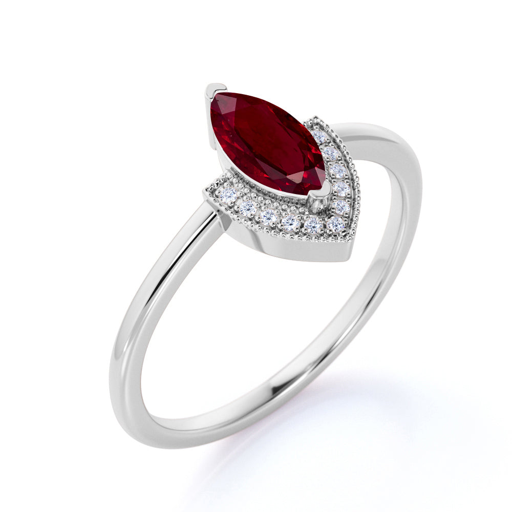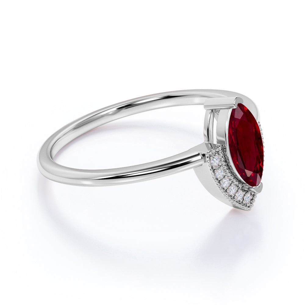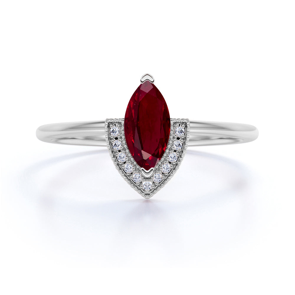 V shaped Style 1.75 Carat Marquise Lab Ruby and Diamond Vintage Engagement Ring in White Gold