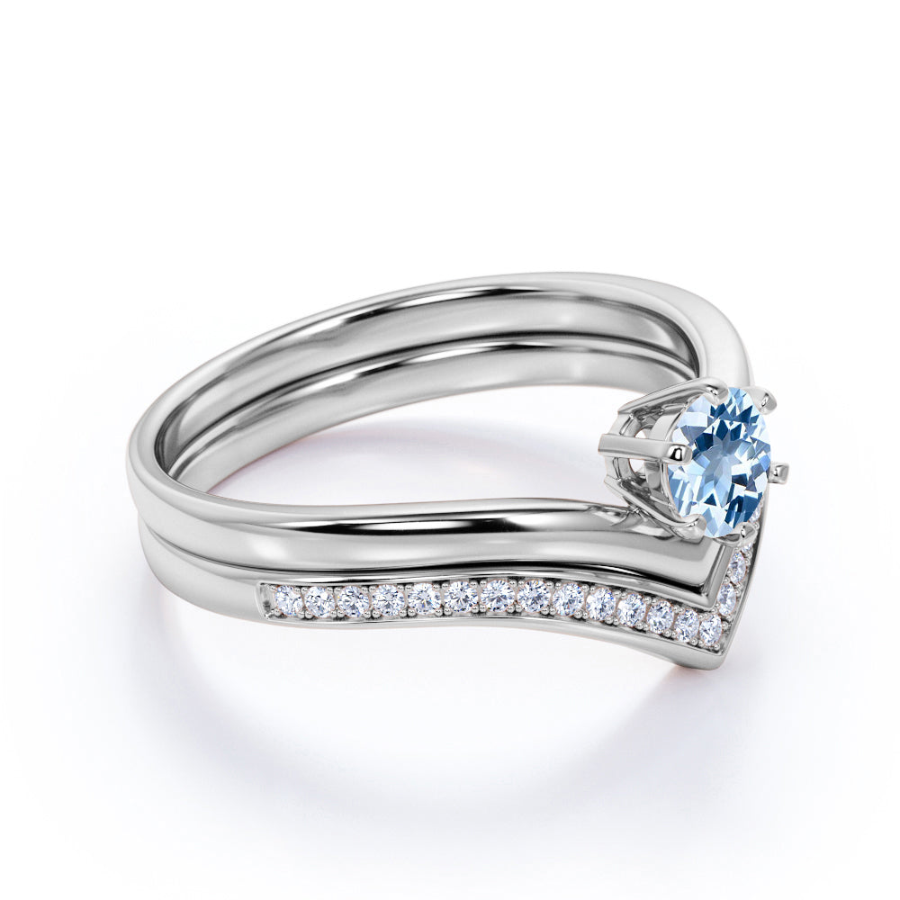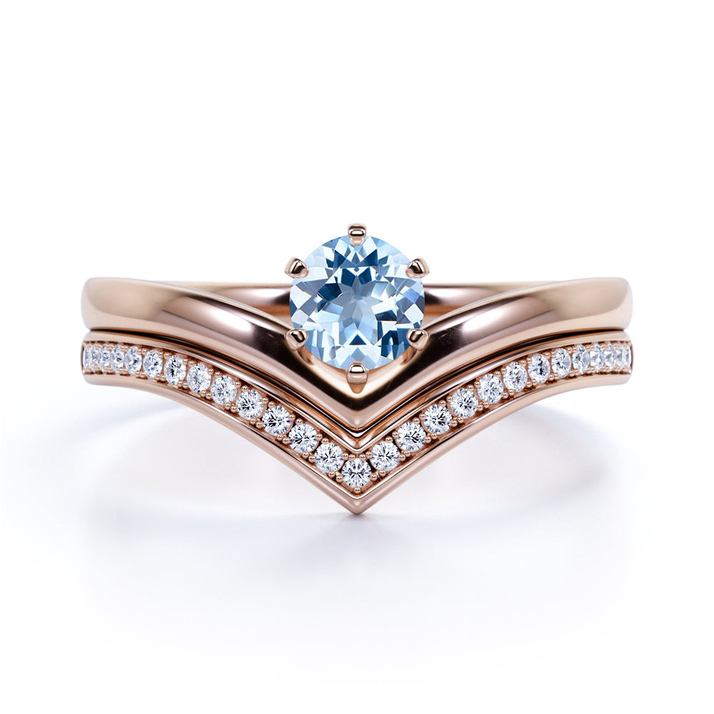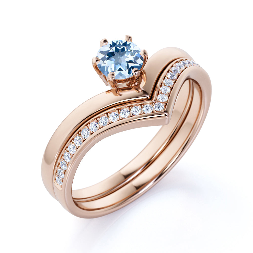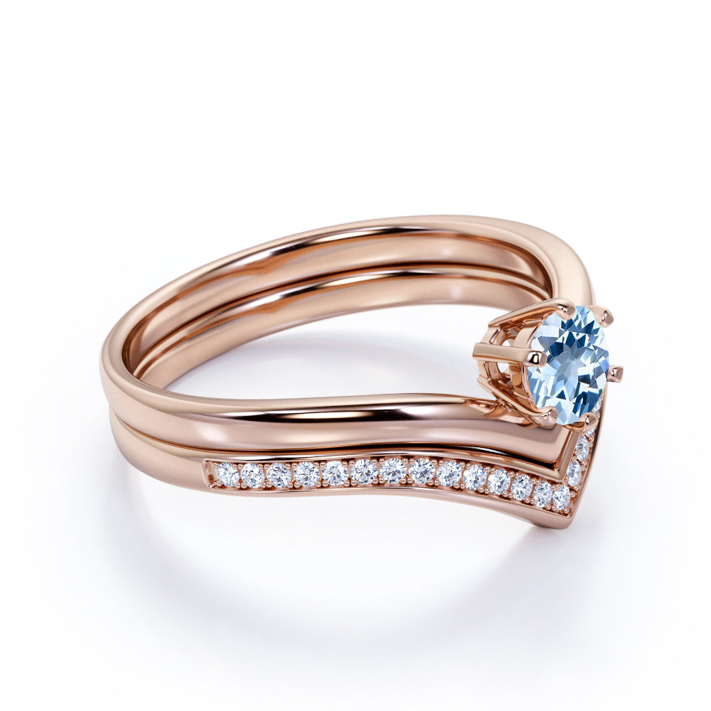 V Shaped Style 1.75 Carat Round Aquamarine and Diamond Bead Bright Wedding Set in Rose Gold