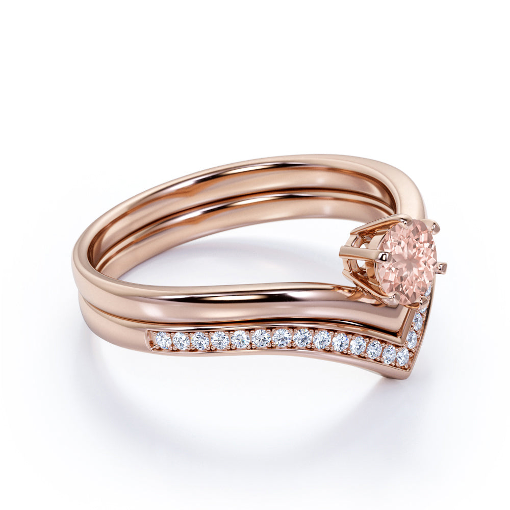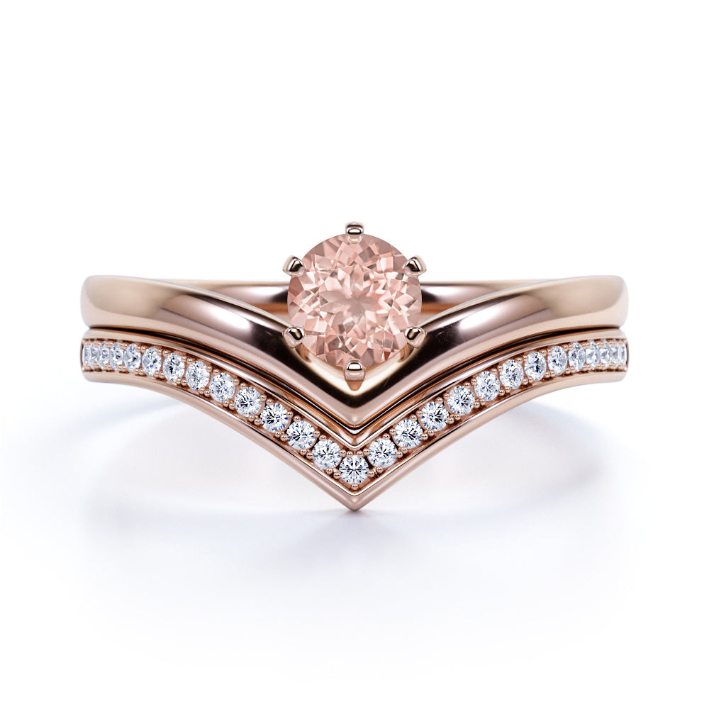 V Shaped Style 1.75 Carat Round Morganite and Diamond Bead Bright Wedding Set in Rose Gold