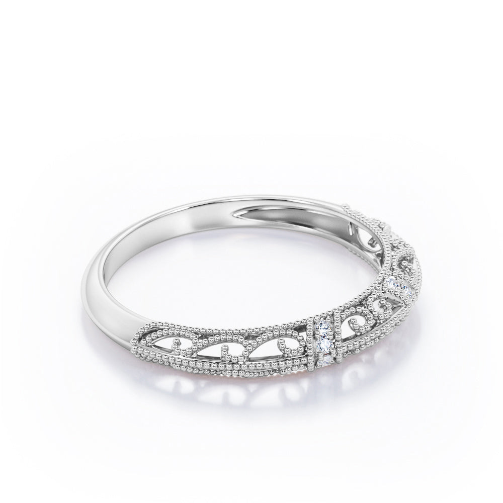 Calm your soul with this Victorian Style - 0.10 TCW Round Shape Diamond - Milgrain Bordered Filigree Wedding Band. Hand-cut with deftness into a lovely shape round cut by our lapidary expertise, this splendid diamond wedding band for women integrates total 0.10 carat. For those looking for something a little out of the ordinary, this cheap diamond wedding band is an excellent choice. This gold diamond wedding band is magnificent in its brilliance and clarity and will be an unmistakable addition to any jewelry collection. Beautiful and affordable, this women's diamond band is a great choice for any woman's jewelry collection. Our cheap diamond wedding band, the birthstone ring for the fourth month, represents riches and extravagance and would make an excellent gift for friends or your better half. This wedding band can be customized in 18K white, rose, yellow, or black gold over silver, or in 10K, 14K, and 18K gold, based on your preference.