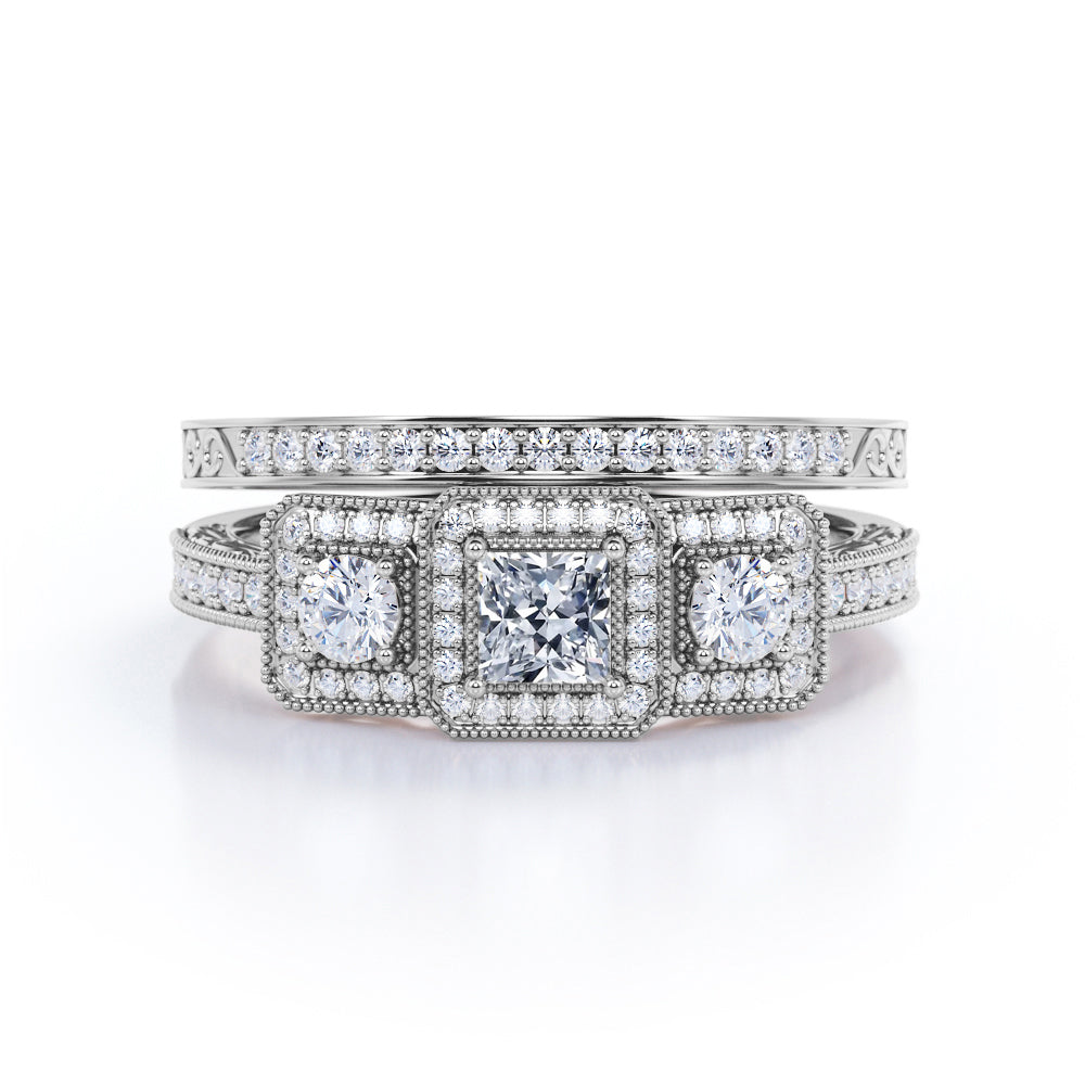 Victorian Style 0.90 Carat TDW Princess Cut Diamond Three Stone Beaded Pave Wedding Ring Set In White Gold