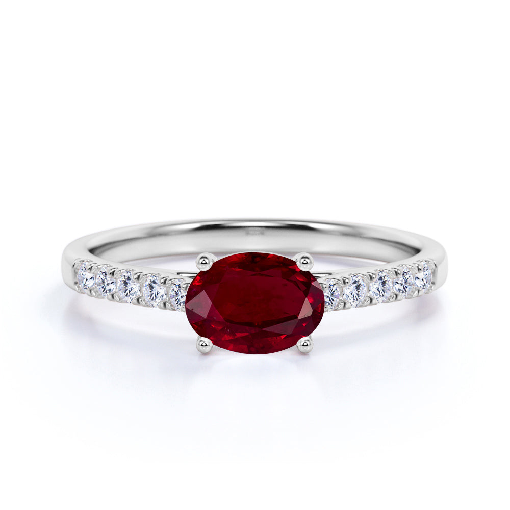 Vintage 1.25 Carat Oval Cut Lab Ruby and Diamond Engagement Ring in White Gold