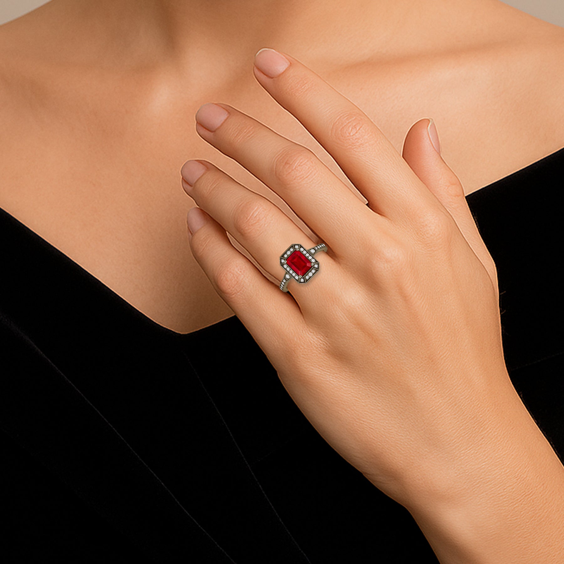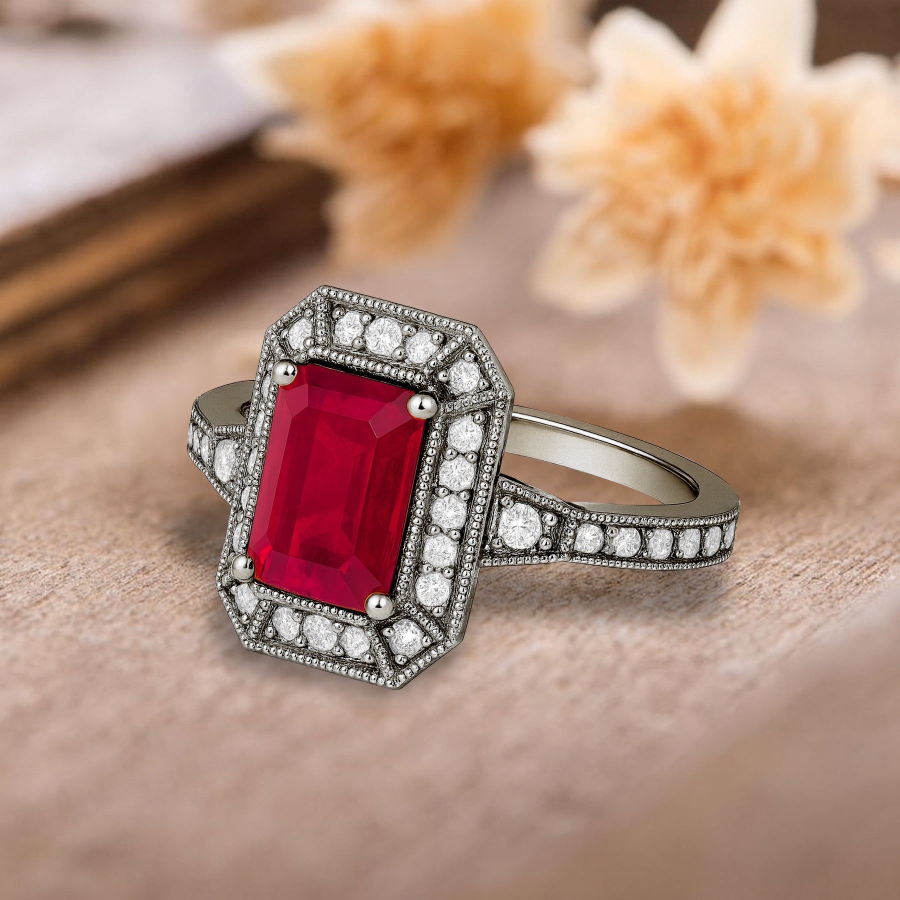 This timeless design features a total carat weight of 1.35 Ct, capturing vintage elegance with a bold pop of color. The centerpiece is a 1 carat emerald cut lab-created ruby, radiating a deep, passionate red that symbolizes love and devotion. The side stones, totaling 0.35 carats, will be Moissanite for silver plated options and Diamond for solid gold, creating a brilliant contrast against the ruby’s rich hue. With its vintage detailing and striking gemstone, this engagement ring is a stunning symbol of romance and classic sophistication.