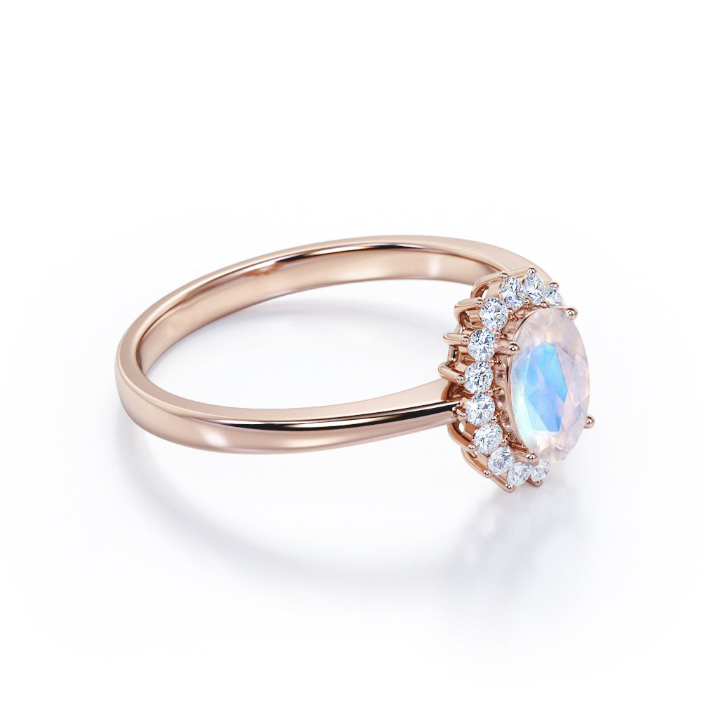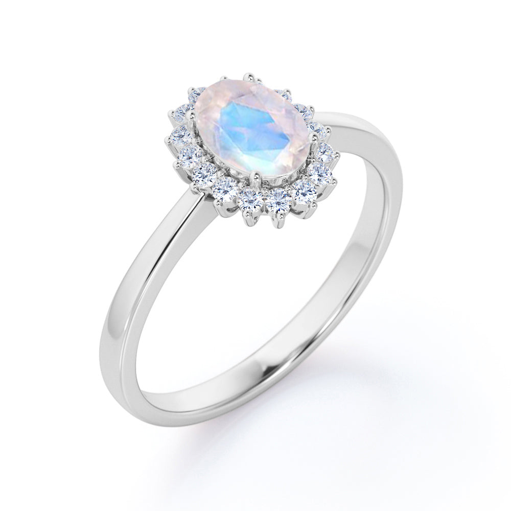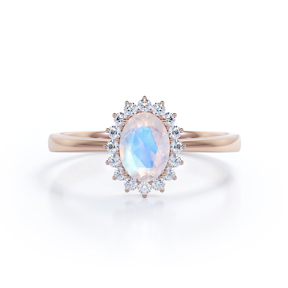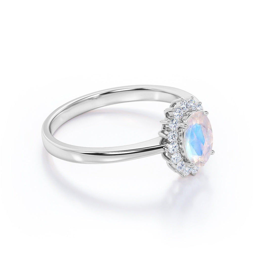The colorful play of light from this faceted blue moonstone and diamond floral engagement ring will surely put a sparkle in your eyes. This vintage engagement ring features an approximately 1.25 carat oval cut natural blue moonstone in the center of the engagement ring, surrounded by .25 carat real diamonds for gold ring and moissanite for silver ring, for a total weight of 1.50 carats.