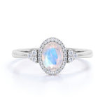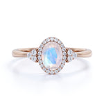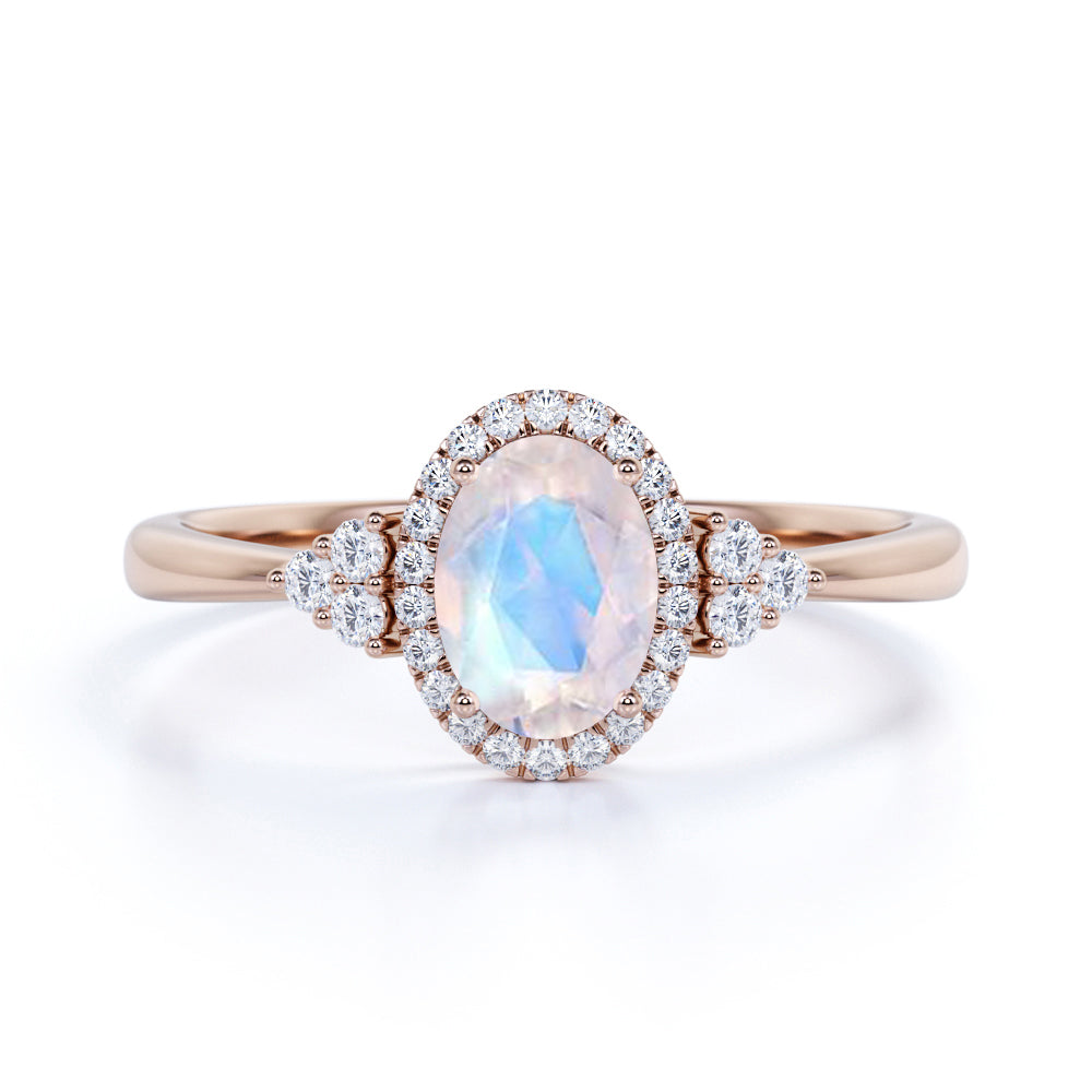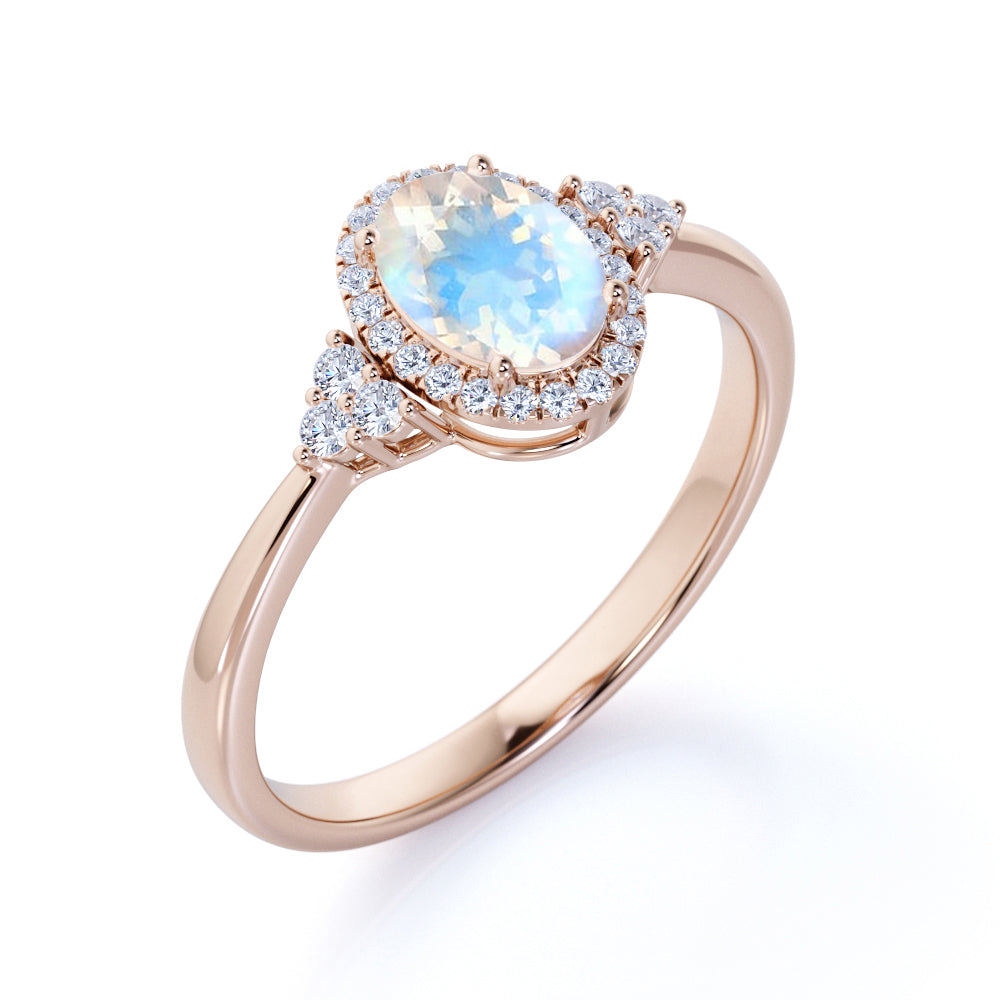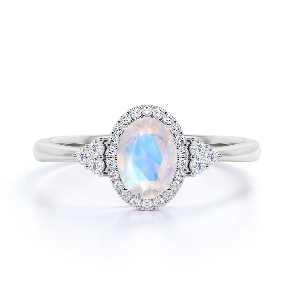 The colorful play of light from this faceted blue moonstone and diamond halo engagement ring will surely put a sparkle in your eyes. This vintage engagement ring features an approximately 1.25 carat oval cut natural blue moonstone in the center of the engagement ring, surrounded by .25 carat real diamonds for gold ring and moissanite for silver ring, for a total weight of 1.50 carats.
