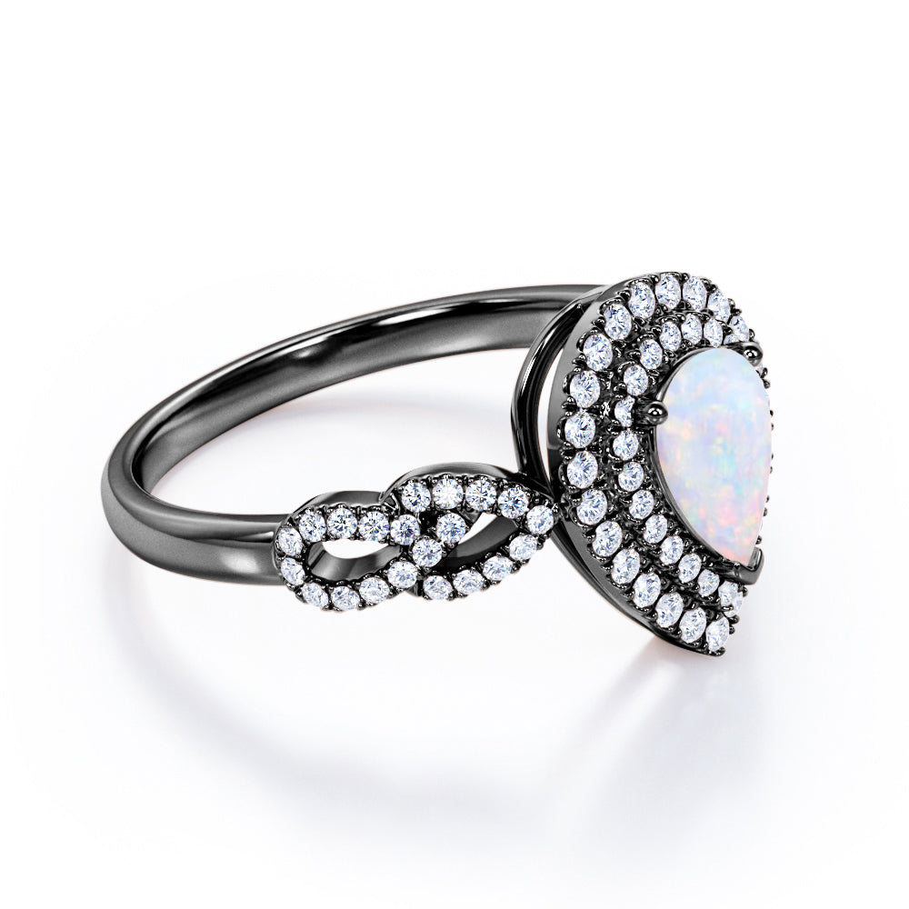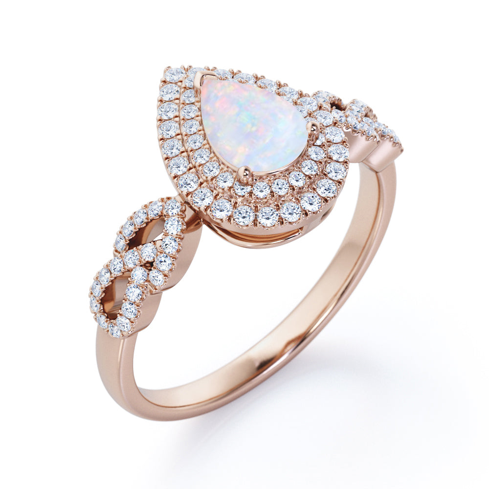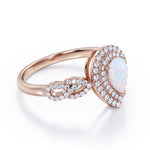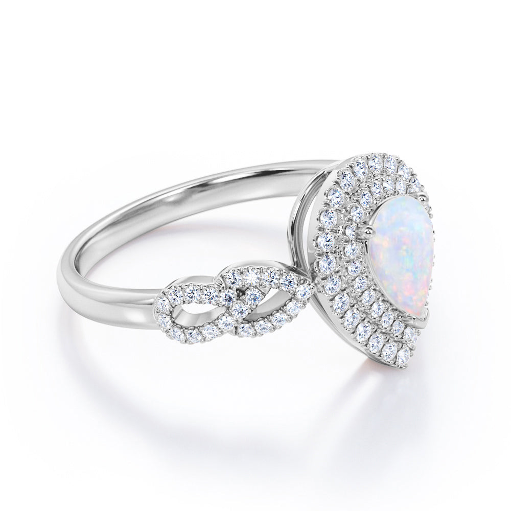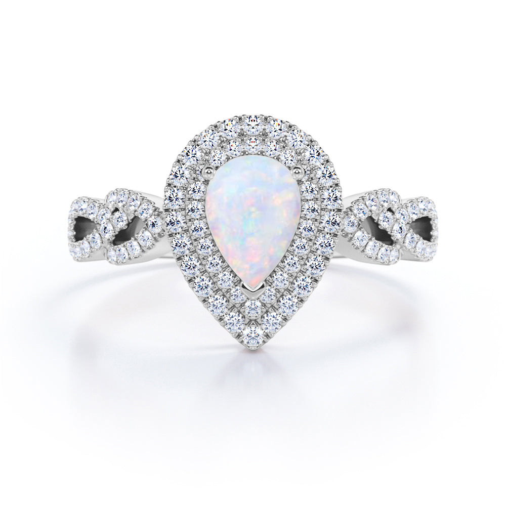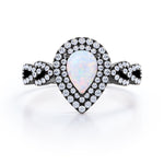 Vintage 1.60 Carat Tear Drop Ethiopian Opal And Diamond Double Halo Engagement Ring In White Gold For Her. Make an unforgettable statement with this extravagant tear drop genuine opal and diamond engagement ring. Vintage inspired, this pear cut ring has serious heirloom quality. The fiery hue of opal looks particularly stunning in a pear cut which has 1 carat weight and sits in the double halo of sparkling diamonds weighing 0.60 carat. This double halo engagement ring is certainly a bold choice that will make you stand out among others. The design on the band embellished with dazzling diamonds will complement your overall ensemble. Handmade with utmost love and devotion, this 1.60 carat tear drop Ethiopian opal and diamond double halo engagement ring in white gold can also be customized to 18k Gold plating over silver, 10k Gold, 14k Gold or 18k Gold as per your preference.