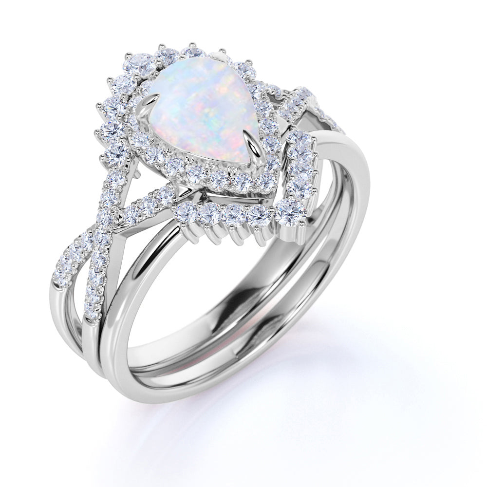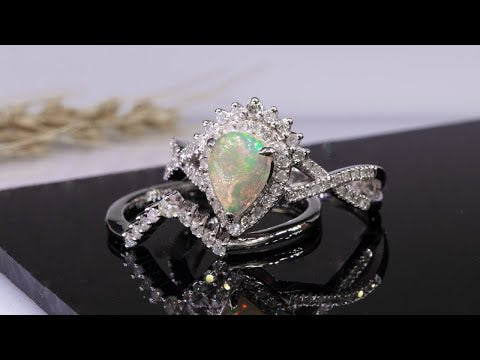 The Antique Design 1.75 Carat Pear White Lab Created Opal and Halo Diamond Best Bridal Set in White Gold has a mesmerizing colors that plays inside and currently one of the most trending gemstone in the market, especially for engagement ring. This Lab Created Opal bridal set features an approximately 1 carat Pear cut white Lab Created Opal in the center of the engagement ring, surrounded by .75 carat real diamonds for gold ring and moissanite for silver ring, for a total weight of 1.75 carats.
