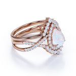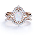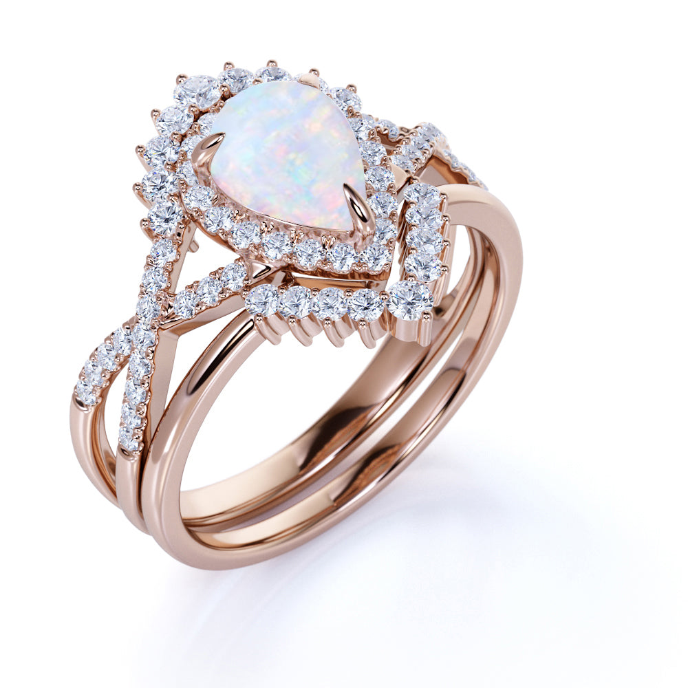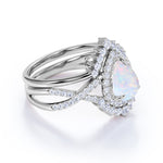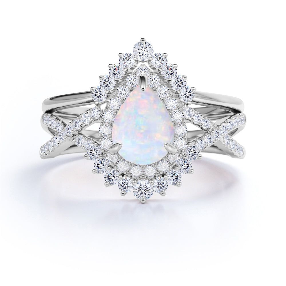 The Antique Design 1.75 Carat Pear White Lab Created Opal and Halo Diamond Best Bridal Set in White Gold has a mesmerizing colors that plays inside and currently one of the most trending gemstone in the market, especially for engagement ring. This Lab Created Opal bridal set features an approximately 1 carat Pear cut white Lab Created Opal in the center of the engagement ring, surrounded by .75 carat real diamonds for gold ring and moissanite for silver ring, for a total weight of 1.75 carats.