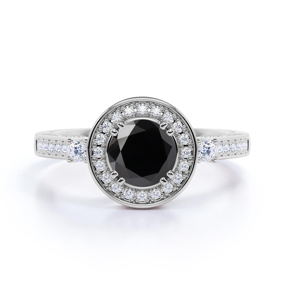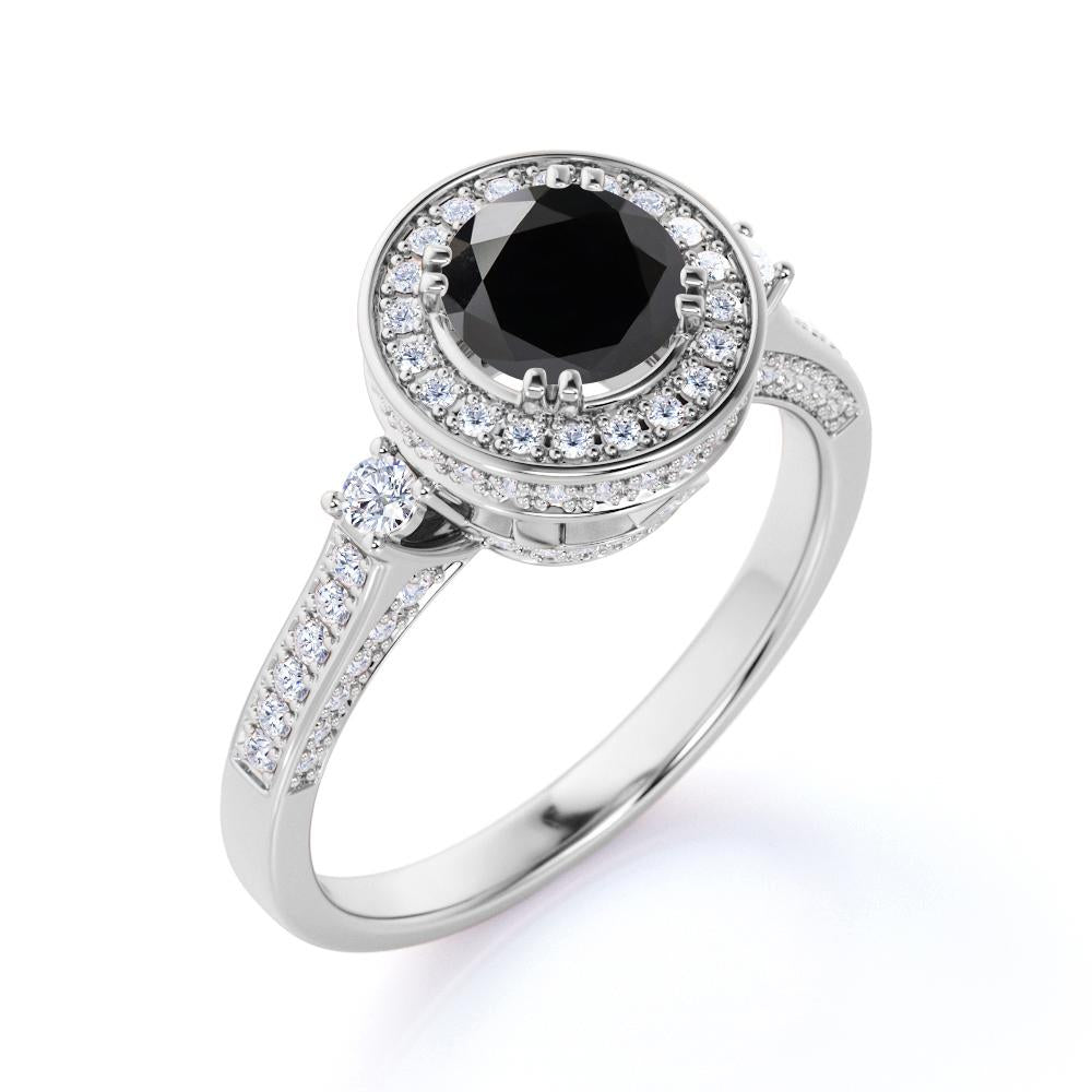 The vintage black diamond ring is quite amazing, since majority of us likes to see a vintage look, especially with an engagement ring that is absolutely beautiful. If you are done with all the unnecessary crazy design, this minimalist black diamond ring is for you. This black diamond ring features an approximately 1 carat round shape lab created black diamond, surrounded by .75 carat certified side diamonds, for a total weight of 1.75 carats.