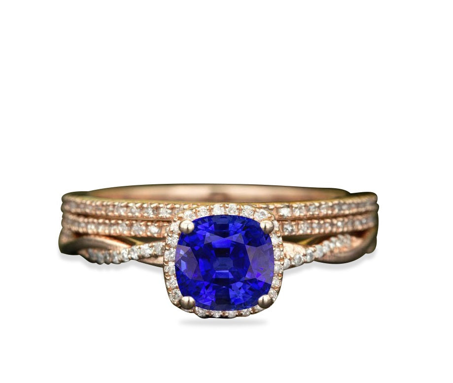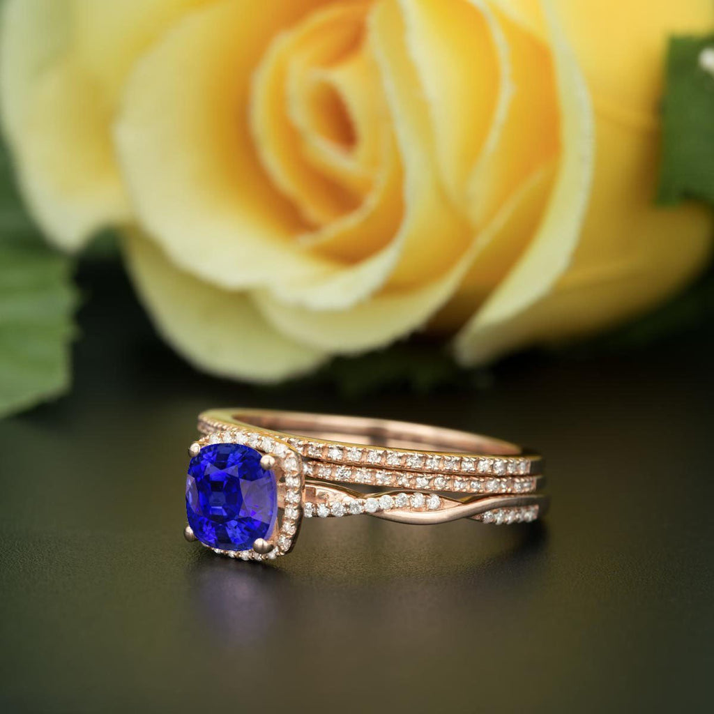 Beautiful 2 Carat Cushion Cut Real Sapphire and Moissanite Wedding Trio Ring Set with Engagement Ring and 2 Wedding Bands in 18k Gold Over Silver. The bridal wedding ring is made with natural Sapphire and high quality Moissanites that can be a perfect alternative to diamond rings as moissanites have almost the same durability and quality as with diamonds that will last for a lifetime. The halo Sapphire trio bridal set is made on real 18k Gold over Silver. The very Unique trio wedding set comes with the main Sapphire engagement ring paired with the 2 pieces Moissanite wedding ring bands to make the perfect trio blue Sapphire and Moissanite trio wedding ring set. Your beautiful jewelry ring comes with a 30 days full refund policy. The beautiful antique Sapphire and Moissanite wedding ring set for women will make the perfect gift for her, whether you are looking for engagement, valentine's day, mothers day or anniversary gift.