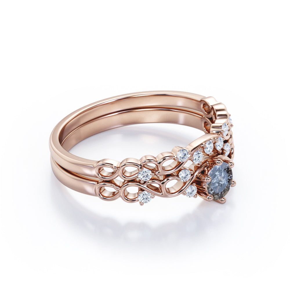 IMPORTANT NOTE: Since each Salt and Pepper Diamonds is one of a kind, the actual color of it may vary from the one that is pictured above. Thanks to its enchanting black and white inclusions, this Vintage 6 Prong Solitaire 0.75 Carat Round Cut Icy Grey Salt and Pepper Diamond and Matching Art Deco Band Wedding Set Rings will be as unique as its wearer. This twist ring features .50 carat round cut natural Salt and Pepper Diamond and .25 carat real side Diamond for gold ring and Moissanite for silver ring. This intricate bridal set rings can be customized to either 10k, 14K and Gold over Silver and either Black Gold, Rose Gold, White Gold or Yellow Gold. Also, as your satisfaction is our most priority, we will do our best to have your handmade jewelry be carefully and beautifully crafted by our expert jewelers. The order also comes with a 30-day full refund policy. Ideal gift for any special occasion, this ring can be gifted on birthday, anniversary, Valentine's day, Christmas, and proposal. This ring is very exclusive due to the unique inclusions of Salt and Pepper Diamond that appears black and white. If you are looking for alternate gemstone, this Salt and Pepper Diamond is right for you. It provides an ideal way to stand out from crowd with a gorgeous and distinctive ring. This antique ring is available at a very affordable price yet it offers a very expensive and gorgeous look on your finger. With its especial color ranging from silky grays to stormy almost blacks, no two Salt and Pepper Diamond rings are alike. Those who has a penchant for vintage and flawless ring would completely fall in love with this affordable ring. Its inclusions reminds us that beauty doesn't always lie in perfection. It is the perfect match for those who are looking for a remarkable gemstone rings as Salt and Pepper embodies their own unique combination of color and uplifting meaning.