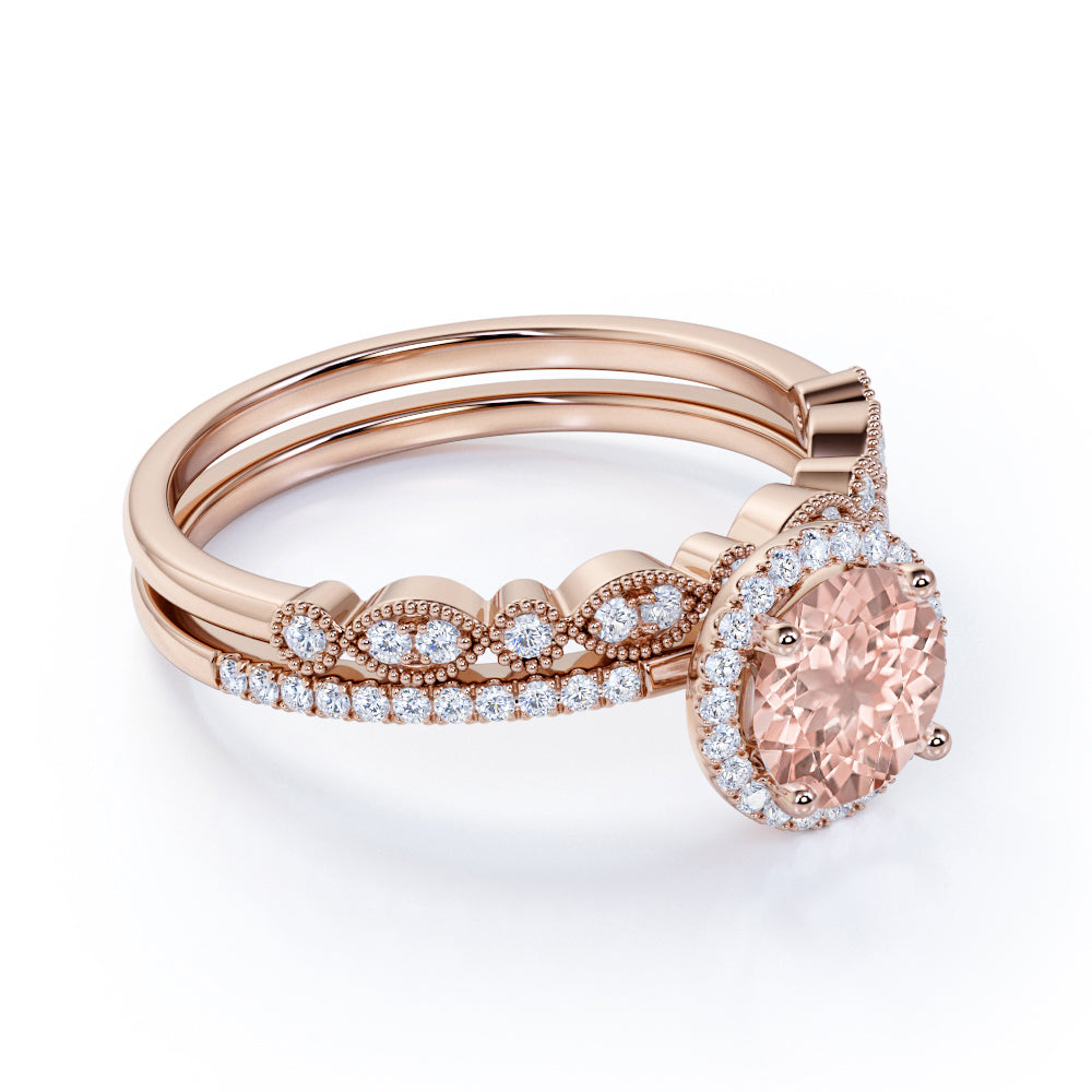 Vintage Antique Design Milgrain 1.75 carat Round Morganite and Diamond Halo Bridal Wedding Ring Set in Rose Gold for Women