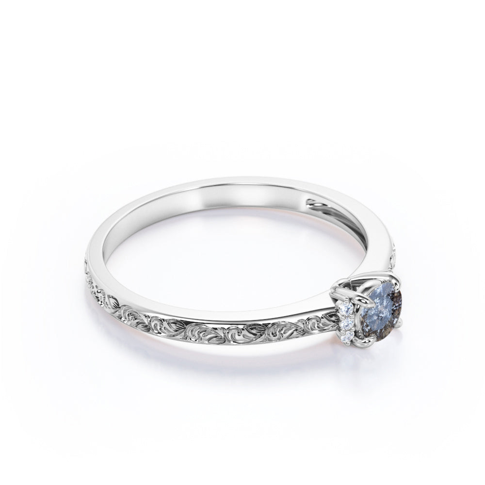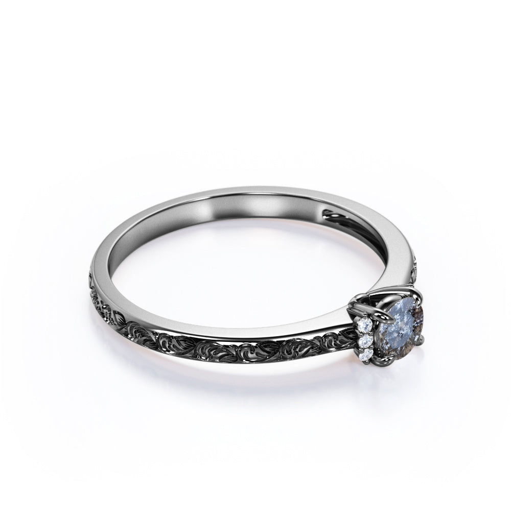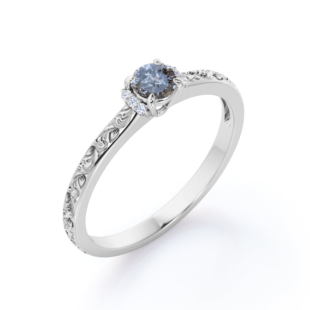 IMPORTANT NOTE: Since each Salt and Pepper Diamonds is one of a kind, the actual color of it may vary from the one that is pictured above. Embellish your love story with the uniqueness of this Vintage Art Deco 0.75 Carat Round Cut Fancy Dark Grey Salt and Pepper Diamond Filigree Engagement Ring in White Gold for Her. This vintage art deco dark grey Salt and Pepper Diamond engagement ring features .50 carat round cut natural Salt and Pepper Diamond and .25 carat real side diamond for gold ring and moissanite for silver ring. This unique filigree Salt and Pepper engagement ring can be customized to either 10k, 14K and Gold over Silver and either Black Gold, Rose Gold, White Gold or Yellow Gold. Also, as your satisfaction is our most priority, we will do our best to have your handmade jewelry be carefully and beautifully crafted by our expert jewelers. The order also comes with a 30-day full refund policy. Enrich your charm and charisma with this vintage dark grey Salt and Pepper Diamond ring for women that is excellent for everyday wear. With its unique appearance, this unique dark grey Salt and Pepper Diamond ring will create a charming and fascinating look on your fingers. With no two diamonds exactly alike, Salt and Pepper Diamond gives each ring character and style. Ornament and distinguish your love story with the neat distribution of black and white inclusions of Salt and Pepper Diamond. Salt and Pepper Diamonds provide an ideal way to stand out from crowd with a gorgeous and distinctive ring. Its inclusions will distinguish your ring offering a unique look on your finger . If you are in search of a unique gift for any occasion, this stunning Salt and Pepper Diamond ring is the best answer for you. Design and create your very own unique Salt and Pepper Diamond ring that makes you outstanding from the rest! Sparkle your finger with this ring which is perfect for any occasion and everyday wear. It is the perfect match for those who are looking for a remarkable gemstone rings as Salt and Pepper embodies their own unique combination of color and uplifting meaning.