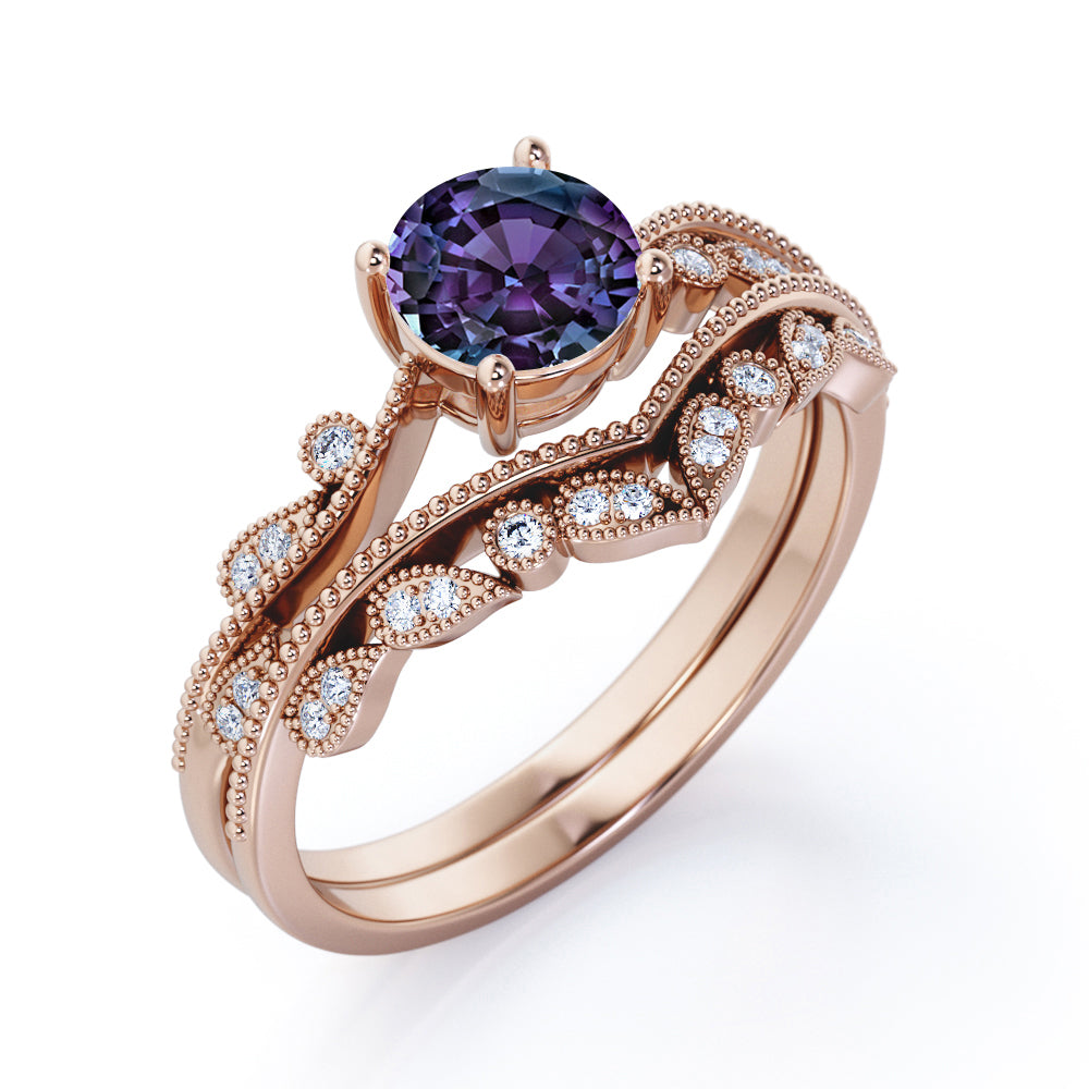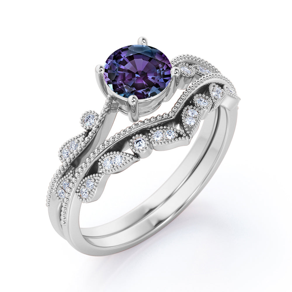 Be on cloud nine with this Vintage Art Deco 1.50 Carat Round Cut Lab Made Purple Alexandrite and Diamond Milgrain Wedding Ring Sets - Bridal Set in White Gold for Her. This vintage milgrain artificial Alexandrite bridal set rings feature 1 carat round cut lab grown Alexandrite and .50 carat real genuine side diamond for gold ring and moissanite for silver ring. This art deco purple Alexandrite wedding ring sets can be customized to either 10k, 14K and Gold over Silver and either Black Gold, Rose Gold, White Gold or Yellow Gold. Also, as your satisfaction is our most priority, we will do our best to have your handmade jewelry be carefully and beautifully crafted by our expert jewelers. The order also comes with a 30-day full refund policy. Crowned as June birthstone, this antique flawless synthetic Alexandrite ring will bring hope as well as encouragement to you. Design your own flawless look with this created Alexandrite ring which you can customize it as per your satisfaction. This flawless man made Alexandrite ring will be a perfect fit for you love story as it is believed that joy enters the lives of people through the stone. If you are searching for some alternate gemstone, this Friday's stone lab created Alexandrite ring will be your right choice. This stunning color-change lab created Alexandrite ring will absolutely complement any style of its wearer. Create a fascinating look on your finger with this lab created Alexandrite ring for women which is available in both solid gold and sterling silver. If you are in search of a perfect gift for any occasion, this delicate and stunning ring is the best answer for you. Design and create your very own unique ring that makes you outstanding from the rest! Those who has a penchant for vintage and flawless ring would completely fall in love with this affordable synthetic Alexandrite ring. With its mesmerizing color-change variety and unparalleled vibrancy, this flawless lab grown Alexandrite ring will enchant your special someone with gracefulness.