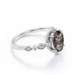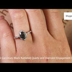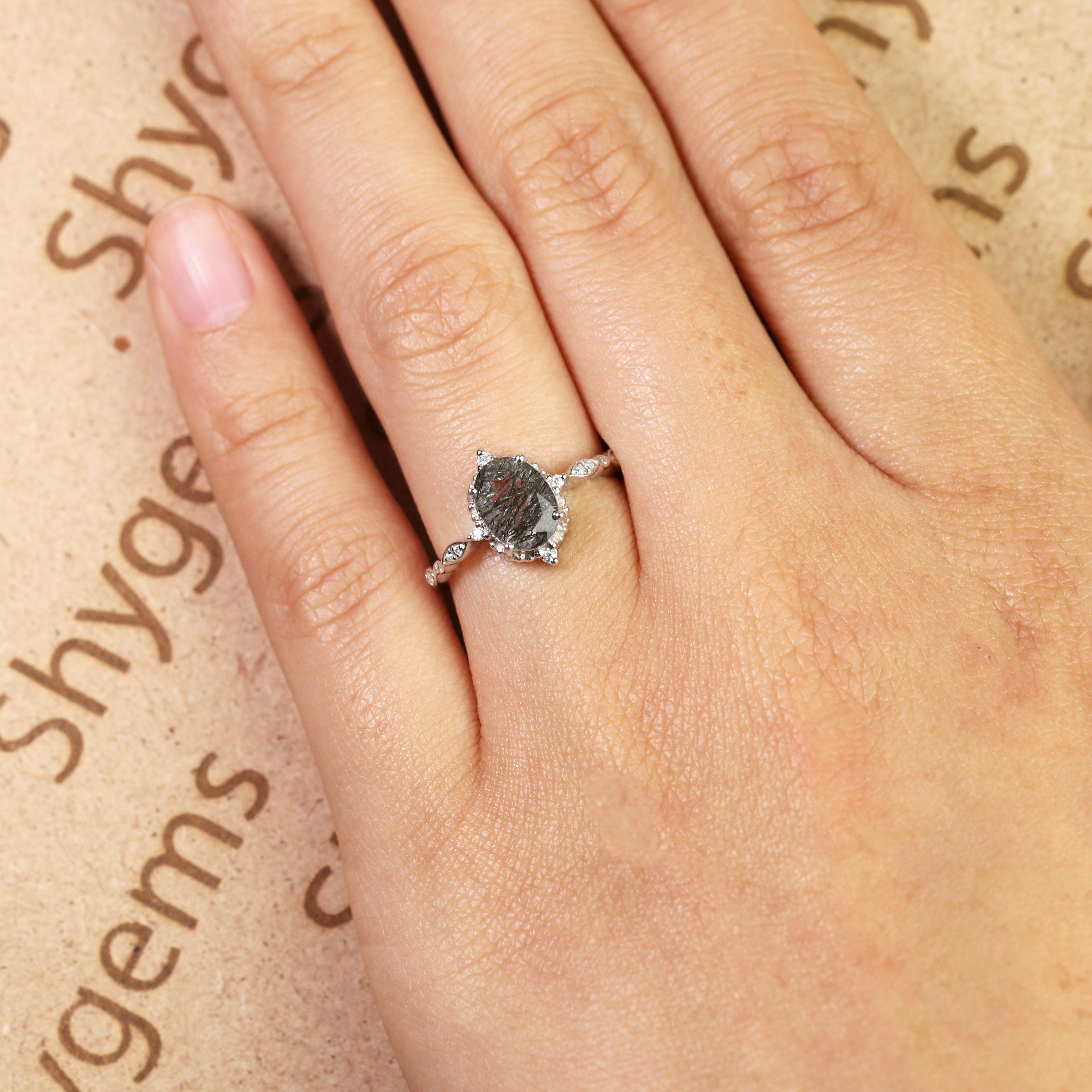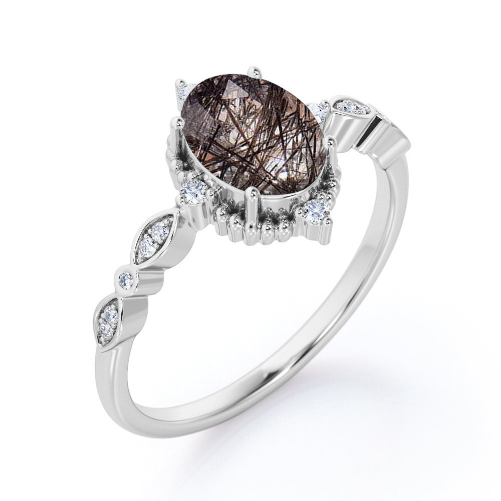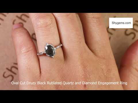 Create an incredibly beautiful look on her finger with this Vintage Bezel 1.25 Carat Oval Cut Druzy Black Rutilated Quartz and Diamond Art Deco Engagement Ring. This vintage art deco genuine rutilated quartz engagement ring features 1 carat oval cut real rutilated quartz and .25 carat real side diamond for gold ring and moissanite for silver ring. This beautiful bezel set engagement ring can be customized to either 10k, 14K and Gold over Silver and either Black Gold, Rose Gold, White Gold or Yellow Gold. Also, as your satisfaction is our most priority, we will do our best to have your handmade jewelry be carefully and beautifully crafted by our expert jewelers. The order also comes with a 30-day full refund policy. This clear crystal with black needle inclusions ring will surely be a perfect gift for your significant other. It is well-known for its powerful healing properties. This tourmalinated black rutilated quartz is believed to be a protection against the ill thoughts of others. Due to its unique clear quartz with druzy black inclusions, this vintage rutilated quartz ring is sure to enchant its wearer. With its distinctive shiny black needles, this genuine druzy rutilated quartz ring is sure to be eye-catching and bring all eyes on you. This ring is available at a very affordable price and available in both silver and gold ring. While many gemstones are most valuable when they contain few or no inclusions, rutilated quartz is actually prized because of its unique inclusions. Being considered a powerful amplifiers of thoughts, this natural rutilated quartz ring offers connection to the Divine mind and receipt of Divine inspiration. Impress your special someone with this beautiful and affordable natural black hair rutilated quartz ring. With its mesmerizing patters of colors and inclusions, this rutilated quartz ring will enchant your special someone with gracefulness.
