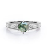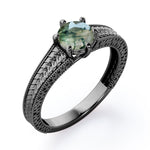 Vintage doesn't always mean dated but it can be an inspiration to create something unique and new. Our Vintage Bowtie Filigree 1 carat Round Moss Green Agate Solitaire Engagement Ring in White Gold features a 1 carat round Moss Green Agate in the center while most of the band is full of intricate details. The band is made similar to a braid ribbon and the side is decorated by filigree zigzag pattern. Add a final touch to the ring with Milgrain which adds an antique style to the ring. It comes at a very affordable price and can be made in 18k gold over silver, 10k gold and 14k gold with the color of white gold, rose gold, yellow gold and black gold.