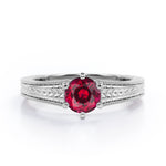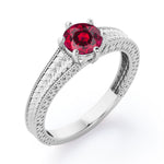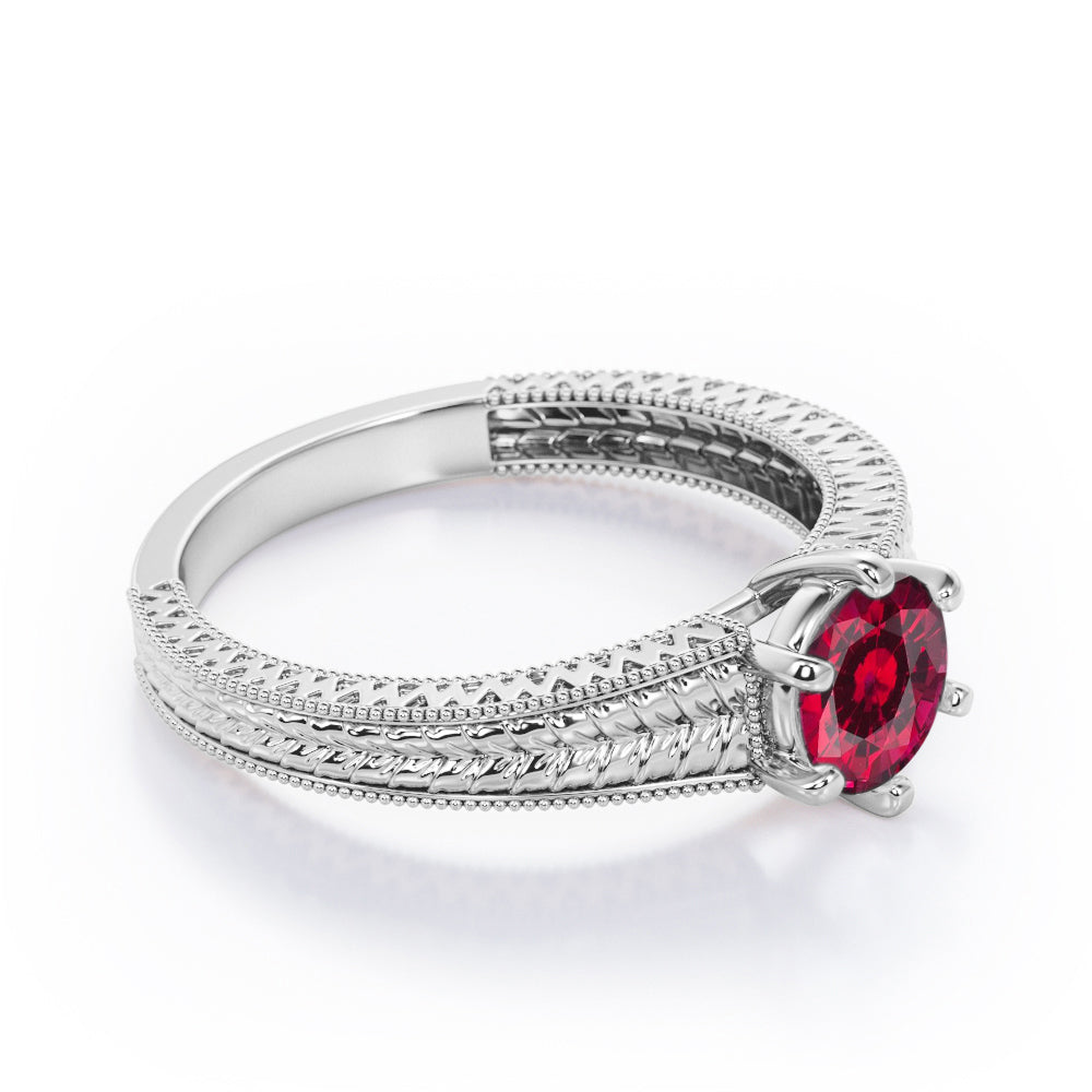 Vintage doesn't always mean dated but it can be an inspiration to create something unique and new. Our Vintage Bowtie Filigree 1 carat Round Lab Ruby Solitaire Engagement Ring in White Gold features a 1 carat round Lab Ruby in the center while most of the band is full of intricate details. The band is made similar to a braid ribbon and the side is decorated by filigree zigzag pattern. Add a final touch to the ring with Milgrain which adds an antique style to the ring. It comes at a very affordable price and can be made in 18k gold over silver, 10k gold and 14k gold with the color of white gold, rose gold, yellow gold and black gold.