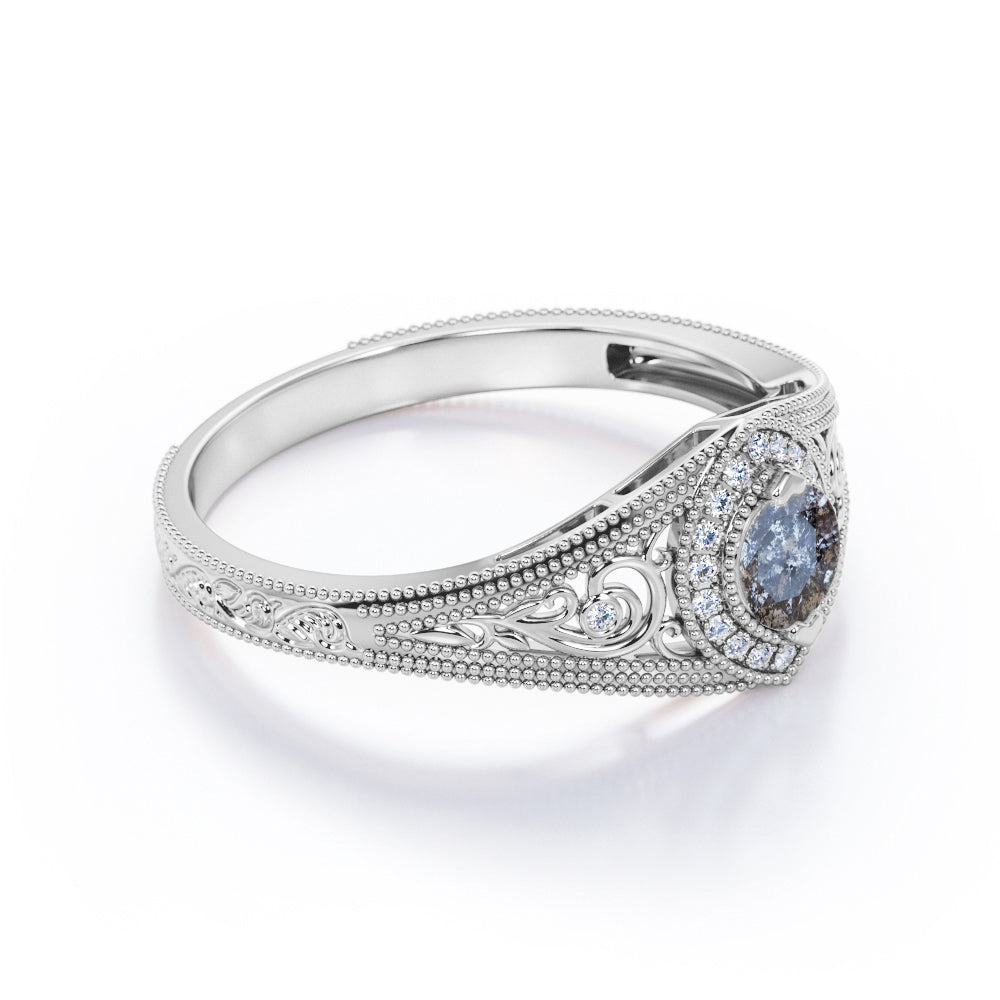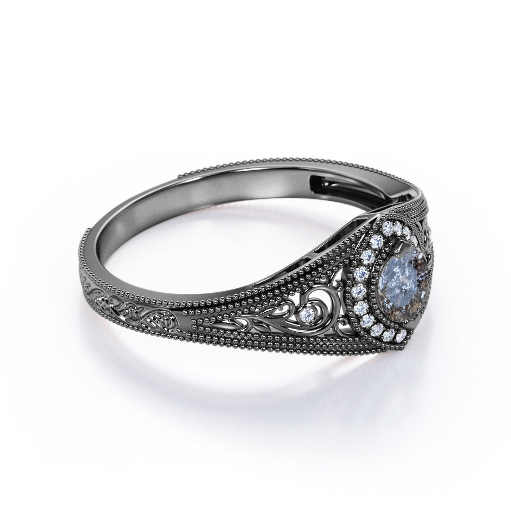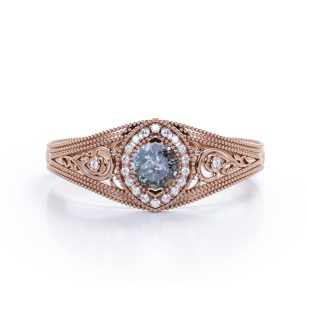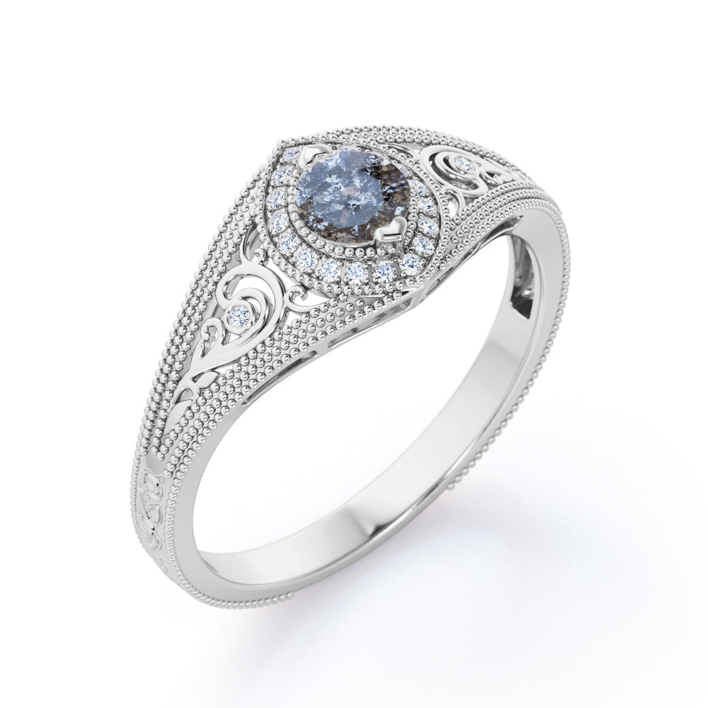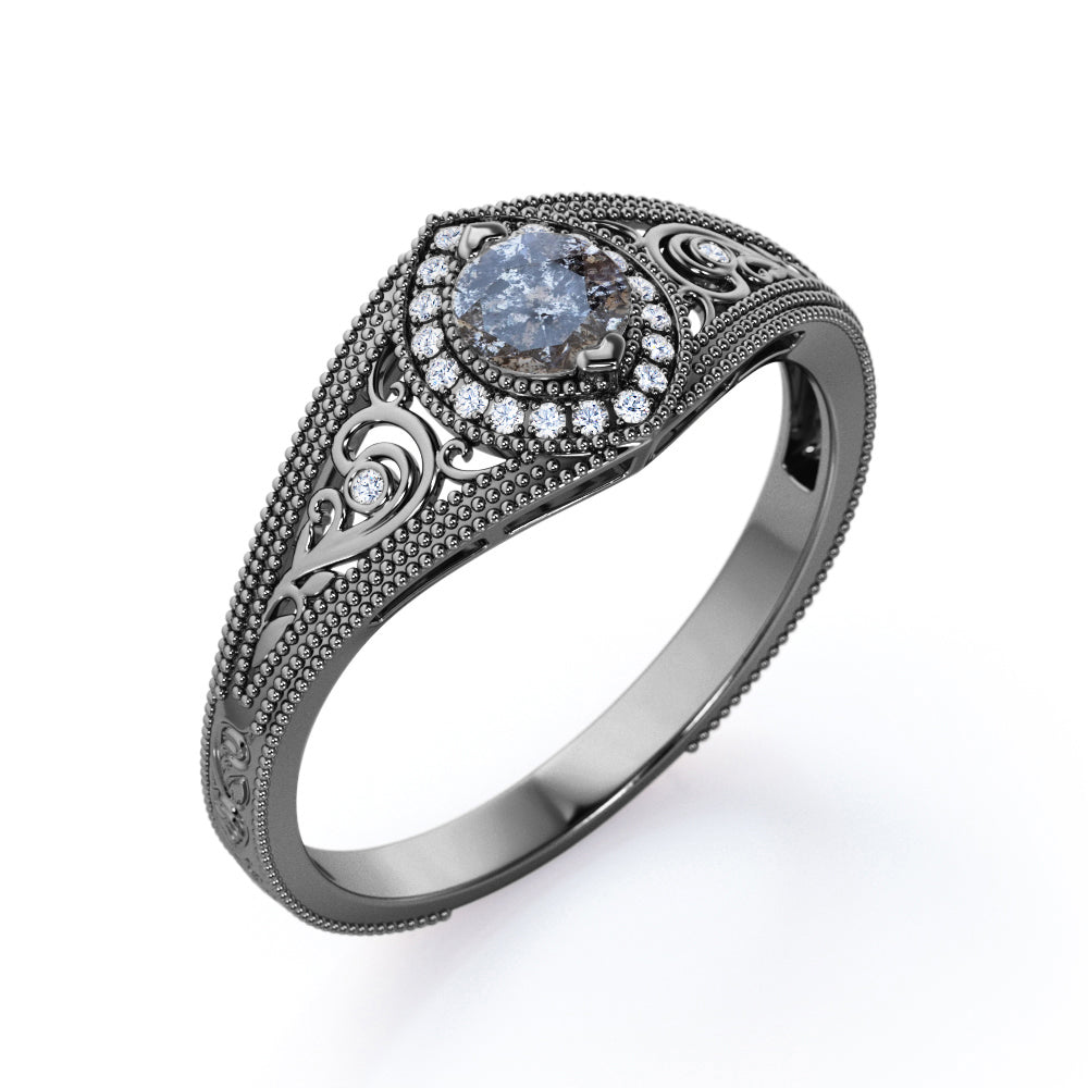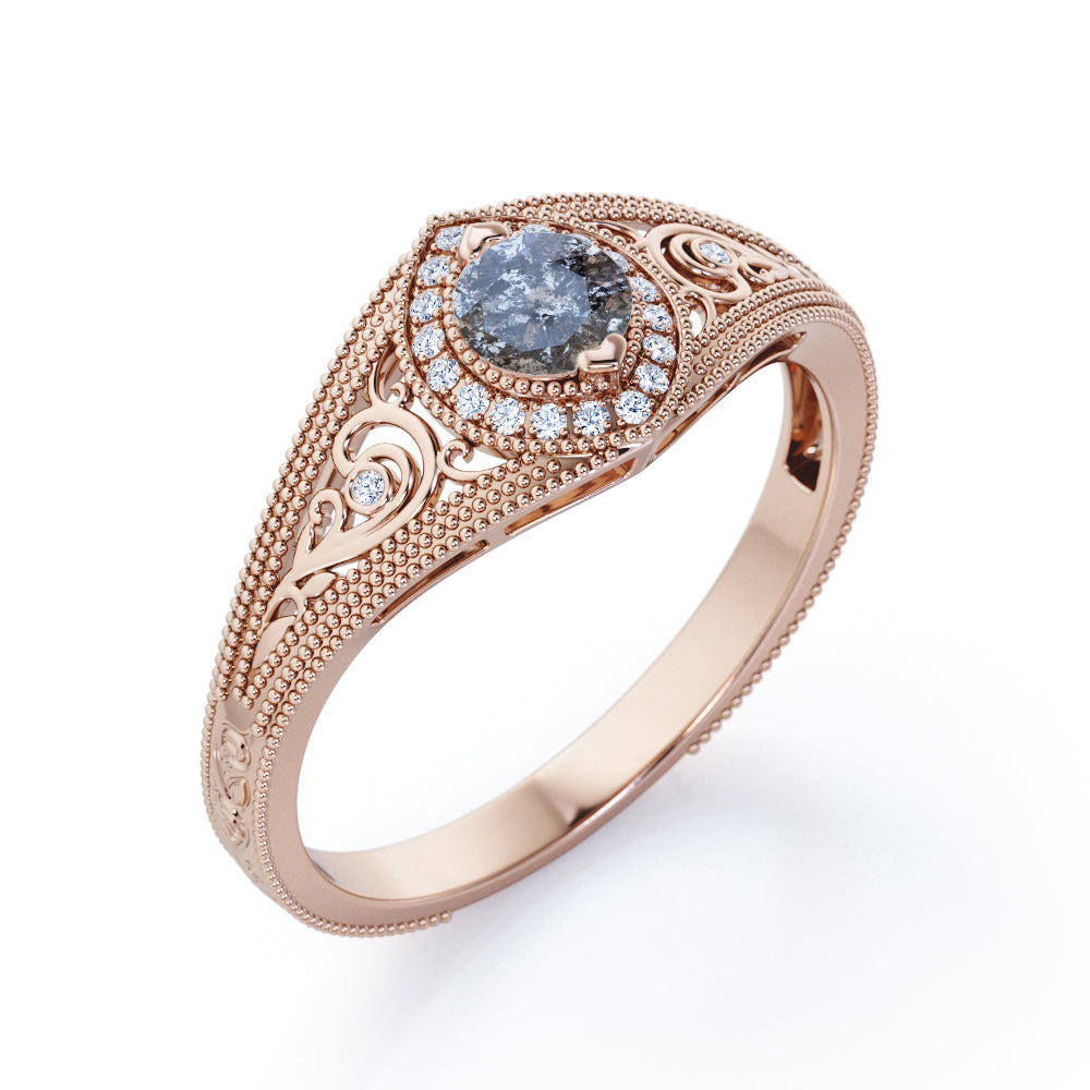 IMPORTANT NOTE: Since each Salt and Pepper Diamonds is one of a kind, the actual color of it may vary from the one that is pictured above. Embellish your love story with the uniqueness of this Vintage Cluster 1 Carat Round Cut Fancy Black Grey Salt and Pepper Diamond Milgrain Engagement Ring in Rose Gold. This vintage Milgrain embellished fancy back grey Salt and Pepper Diamond engagement ring features 0.50 carat round cut natural Salt and Pepper Diamond and .50 carat real side diamond for gold ring and moissanite for silver ring. This unique cluster Salt and Pepper engagement ring can be customized to either 10k, 14K and Gold over Silver and either Black Gold, Rose Gold, White Gold or Yellow Gold. Also, as your satisfaction is our most priority, we will do our best to have your handmade jewelry be carefully and beautifully crafted by our expert jewelers. The order also comes with a 30-day full refund policy. Enrich your charm and charisma with this vintage dark grey Salt and Pepper Diamond ring for women that is excellent for everyday wear. With its unique colors and inclusions, this natural grey Salt and Pepper will bring more personal touch to the traditional ring. With no two diamonds exactly alike, Salt and Pepper Diamond gives each ring character and style. If you are searching for some alternate gemstone with unique appearance, this Salt and Pepper Diamond ring will be your right choice. Salt and Pepper Diamonds suit a variety of ring styles and easily adapted to suit any type of fashion sense. Create a fascinating look on your finger with this Salt and Pepper Diamond ring for women which is available in both solid gold and sterling silver. Diversity of Salt and Pepper Diamond provides additional character to your traditional engagement ring. This antique ring is available at a very affordable price yet it offers a very expensive and gorgeous look on your finger. Sparkle your finger with this ring which is perfect for any occasion and everyday wear. It is the perfect match for those who are looking for a remarkable gemstone rings as Salt and Pepper embodies their own unique combination of color and uplifting meaning.