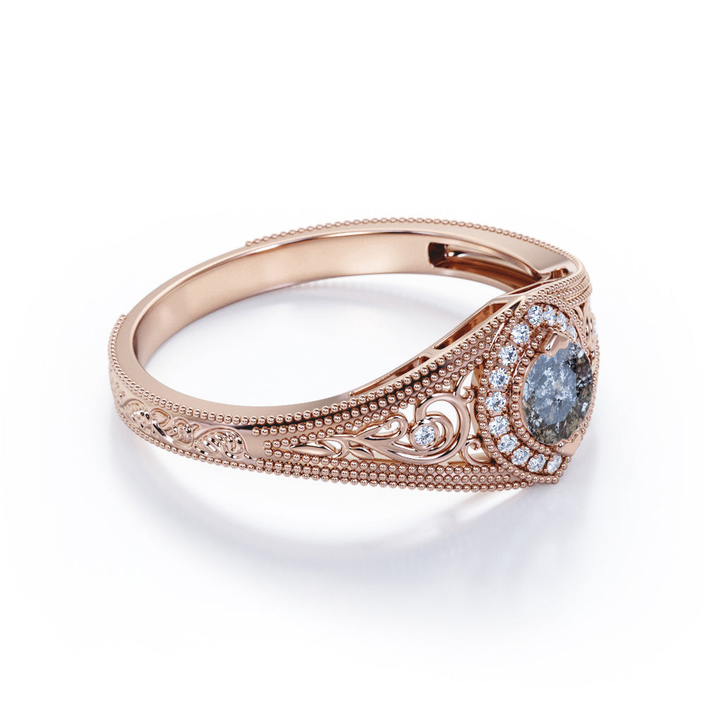 Vintage Cluster 1 Carat Round Cut Fancy Black Grey Salt and Pepper Diamond Milgrain Engagement Ring in Rose Gold