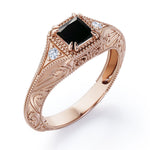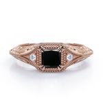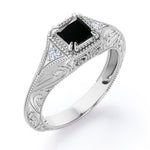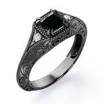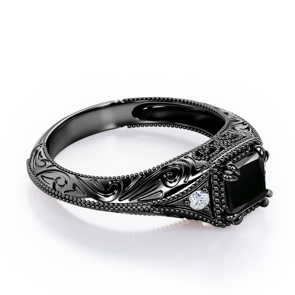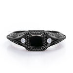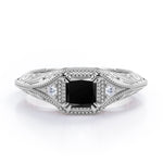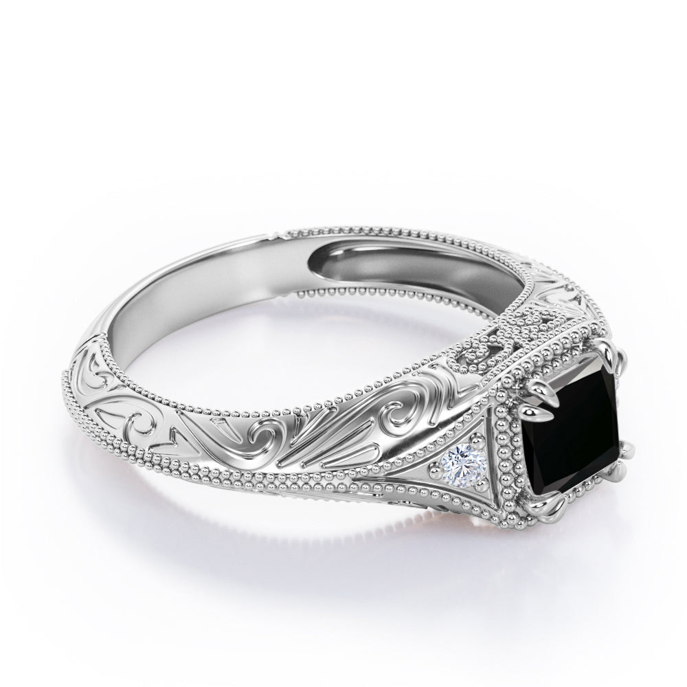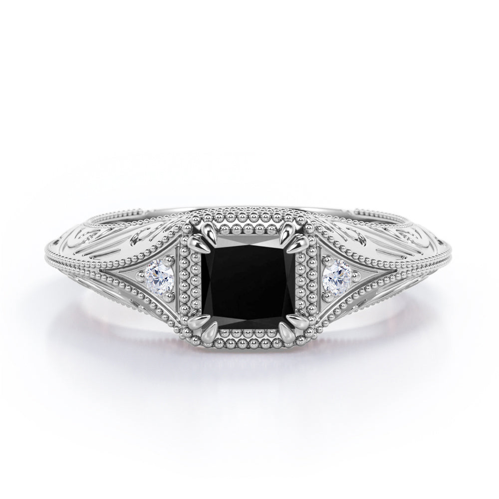 Vintage Eight Claws 1.10 Carat Princess Cut Black Diamond Three Stone Engagement Ring In White Gold. If youre looking for something more elaborate with a vintage flair, you will certainly love this addition to our Black diamond rings collection. Regal and whimsical, this lab created black diamond engagement ring is sure to stand out. This princess cut antique ring is full of rich tones. The unique art deco work in the band offers a delicate and feminine detail and vintage aesthetic as well. The art deco in the band is a highly exceptional and commendable job of our well-experienced artisans who leaves no stone unturned to meet your satisfaction. The sharp eight claws holds the 1 carat center stone firmly allowing it to radiate immense sparkle. This vintage eight claws 1.10 carat princess cut black diamond three stone engagement ring in white gold can also be customized to 10k Gold or 14k Gold as you prefer. This distinctive piece is the perfect option for the bride who is both minimalistic yet unconventional.