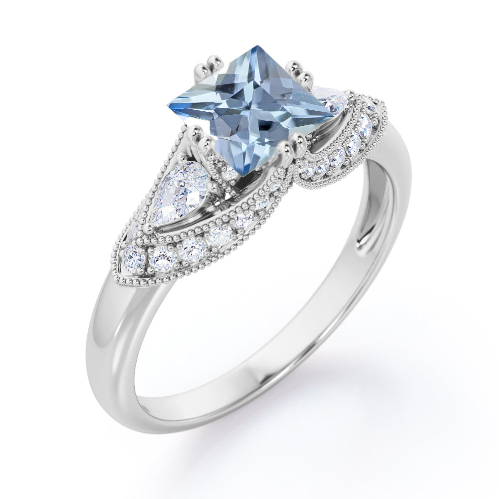 Vintage Eight Prongs 1.30 Carat Princess Cut Aquamarine And Diamond Marquise Framed Beaded Engagement Ring In White Gold. A stunning and affordable option, this Aquamarine and diamond engagement ring puts on quite the show. This tantalizing engagement ring features 1 carat princess cut aquamarine framed by 0.30 carat of side diamonds. The eight prongs holds the center stone firmly while the wedding band in white gold perfectly complements the ring and adds just the right amount of sparkle. The antique milgrain and filigree work at the edges is an exceptional example of our old craftsmanship. This vintage eight prongs 1.30 carat princess cut aquamarine and diamond marquise framed beaded engagement ring in white gold can also be customized to 18k Gold plating over silver, 10k Gold, 14k Gold as per your preference. So, hurry up and make this exclusive engagement ring all yours forever. Please note that if the ring is made over silver, the side stone will be moissanite and if it is made on gold, diamond will be employed as the side stone.