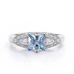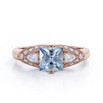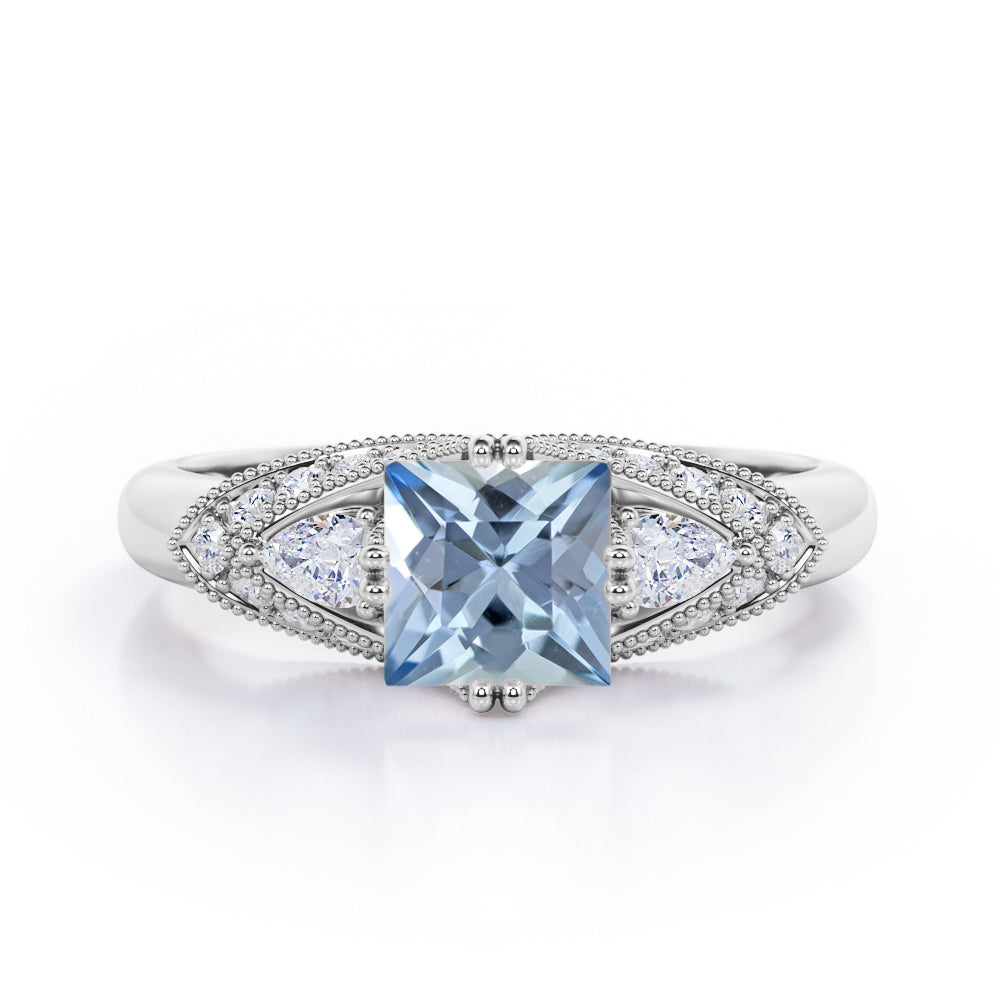 Vintage Eight Prongs 1.30 Carat Princess Cut Aquamarine And Diamond Marquise Framed Beaded Engagement Ring In White Gold. A stunning and affordable option, this Aquamarine and diamond engagement ring puts on quite the show. This tantalizing engagement ring features 1 carat princess cut aquamarine framed by 0.30 carat of side diamonds. The eight prongs holds the center stone firmly while the wedding band in white gold perfectly complements the ring and adds just the right amount of sparkle. The antique milgrain and filigree work at the edges is an exceptional example of our old craftsmanship. This vintage eight prongs 1.30 carat princess cut aquamarine and diamond marquise framed beaded engagement ring in white gold can also be customized to 18k Gold plating over silver, 10k Gold, 14k Gold as per your preference. So, hurry up and make this exclusive engagement ring all yours forever. Please note that if the ring is made over silver, the side stone will be moissanite and if it is made on gold, diamond will be employed as the side stone.