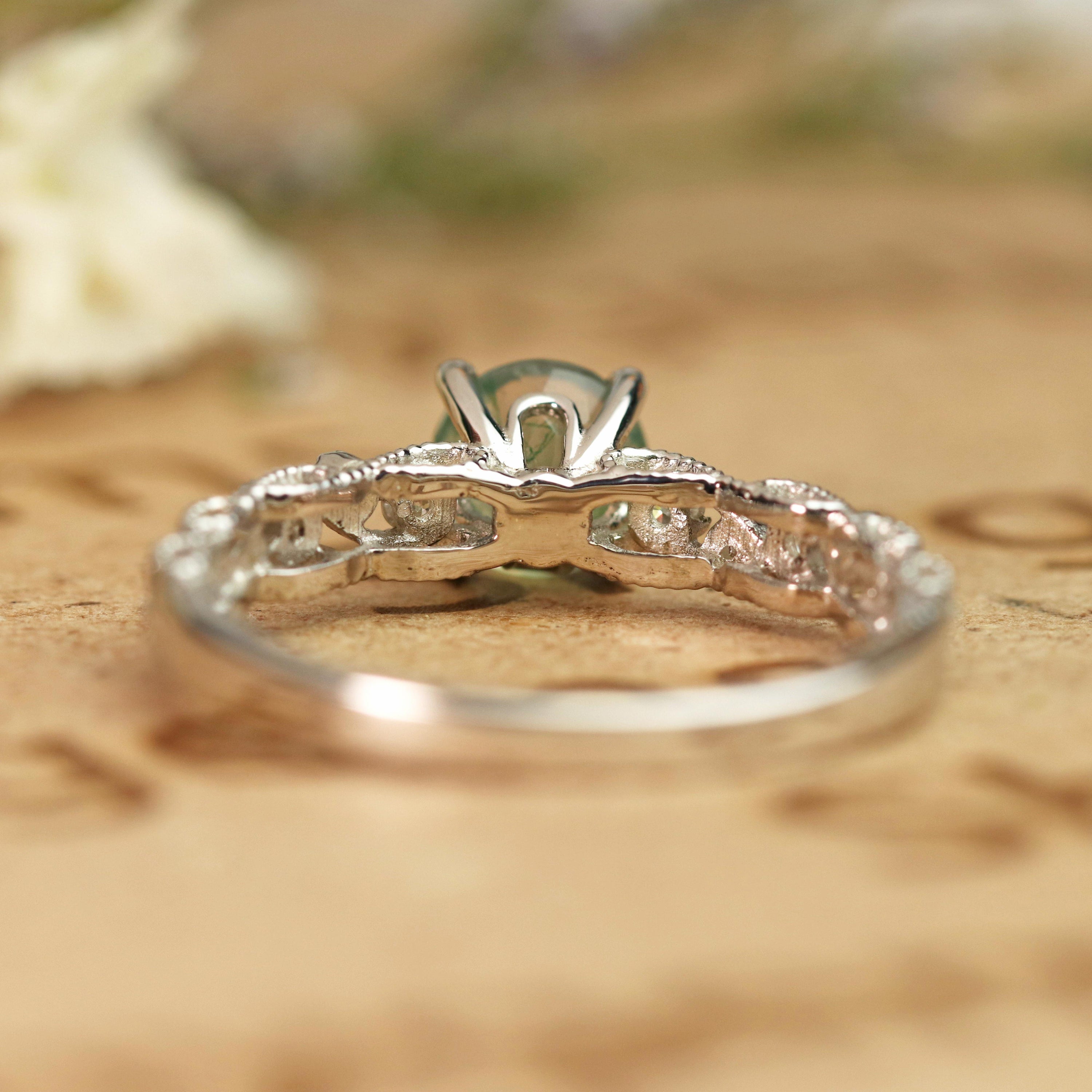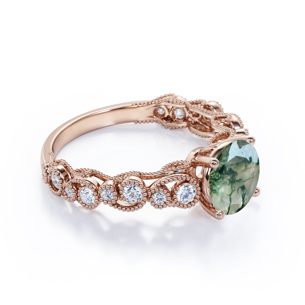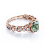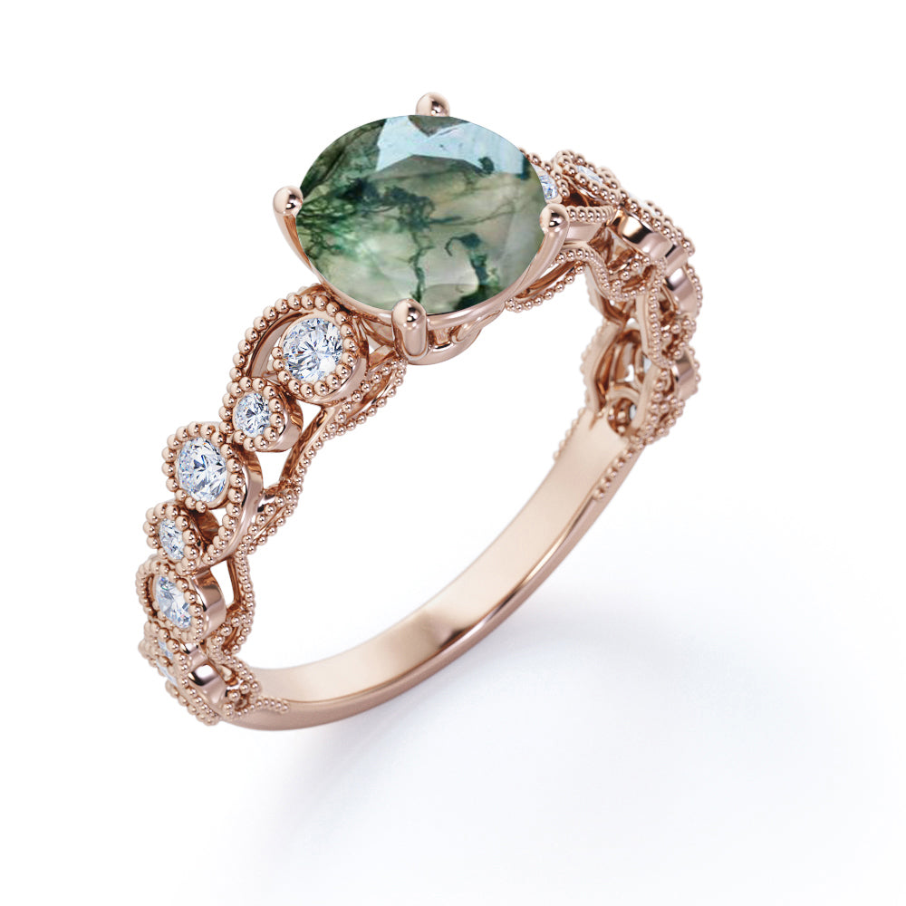 Paint your love story with this Vintage Exquisite Prong 1.50 Carat Round Cut Real Faceted Druzy Moss Green Agate and Diamond Art Deco Milgrain Engagement Ring. This beautiful milky white moss agate ring features 1 carat round cut natural moss green agate and .50 carat real genuine side diamond for gold ring and moissanite for silver ring. This antique engagement ring can be customized to either 10k, 14K and Gold over Silver and either Black Gold, Rose Gold, White Gold or Yellow Gold. Also, as your satisfaction is our most priority, we will do our best to have your handmade jewelry be carefully and beautifully crafted by our expert jewelers. The order also comes with a 30-day full refund policy. This green colored minerals with banded inclusions ring will surely be a perfect gift for your special someone. It is believed to bring abundance in wealth and improve self-esteem. Encourage trust and hope with this real green Agate ring that shows a variety of white with green inclusions that resembles moss. Own this ring which displays one of the most unique patterns of color and stand out from the rest. Perfect for everyday wear, this polished veined moss green Agate gemstone is resistant to chemical attack. Create a fascinating look on your finger with this moss green Agate ring which is available in both solid gold and sterling silver. It perfectly fit those who are looking for a very unique ring that no two rings are alike. Crowned as a stone of power and wealth, this green Agate with mossy inclusions ring will attract abundance in all forms. Impress your special someone with this beautiful and affordable milky white moss green Agate ring. Handcrafted with love, this antique ring will complement any style and enhance the charm of its wearer.