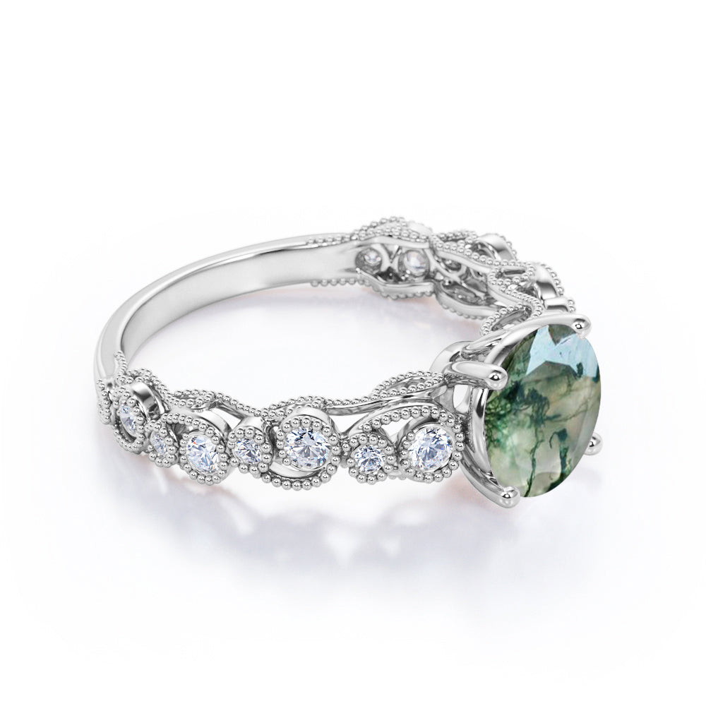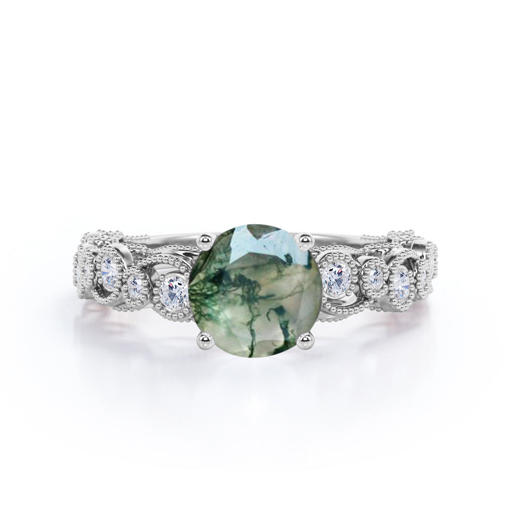 Vintage Exquisite Prong 1.50 Carat Round Cut Real Faceted Druzy Moss Green Agate and Diamond Art Deco Milgrain Engagement Ring