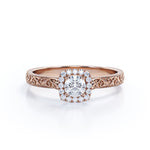 An old style that is never old; vintage rings are still one of the best selling rings that people choose for their special someone. So if your beloved one is a fan of antique style ring this Vintage Filigree 0.7 carat Round Moissanite and Diamond Halo Engagement Ring in Rose Gold would make her excited. The promise ring displays a 0.5 carat Moissanite at the center and it is surround by paved round Moissanite. Cushion halo creates a visual illusion for the center stone, though it is in round cut but Moissanite accent makes it looks like a cushion cut and full. The band is garnished with scrolled engraving and edges by Milgrain line. This Moissanite ring is available in white gold, rose gold, yellow gold and black with the metal option of 18k gold over silver, 10k gold, 14k gold.