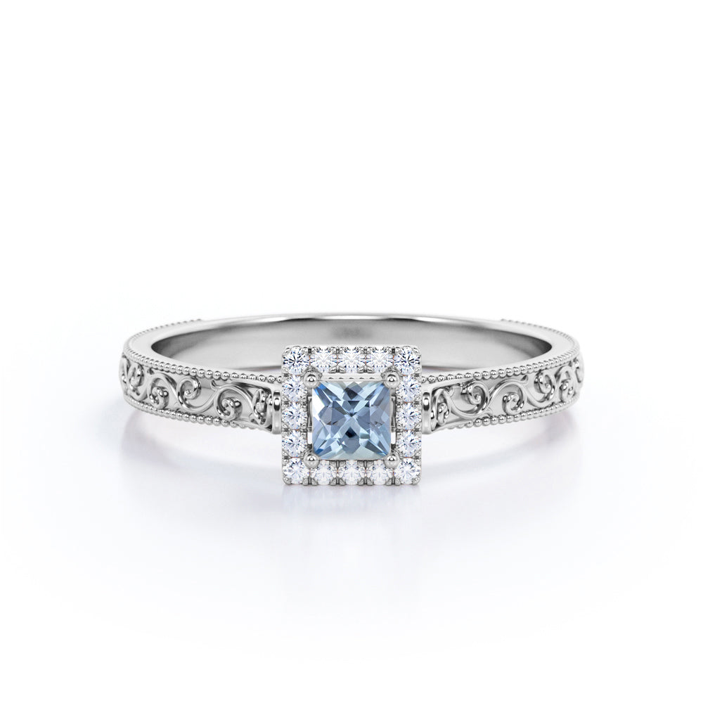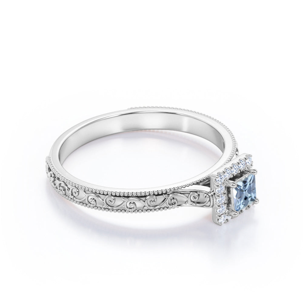 Vintage Filigree 1.10 Carat Princess Cut Aquamarine And Diamond Halo Engagement Ring In White Gold. Delight her heart with this vintage promise ring. The gorgeous ring features a perfect blue aquamarine center stone that is unquestionably pleasing to the eyes surrounded by paved dazzling diamond side stones in a halo setting that sparkles when viewed from any angle. The ring band of this antique engagement ring highlights a delicate filigree engraving edged with milgrain beadings passionately handcrafted by our talented and experienced jewelers. Handmade to perfection, this filigree promise ring is made with 1 carat very fine princess-cut blue aquamarine center stone, surrounded by, 0.10 carat dazzling diamond side stones for the gold rings and moissanite for the silver rings that weigh a total of 1.10 carat. Also, it can be made between 18k gold over silver, 10k gold, and 14k gold depending on your preferred customization. Please kindly note for the silver ring option that silver is a very sensitive metal, any chemicals like hand creams, lotion, or sanitizers. etc., can affect the plating.