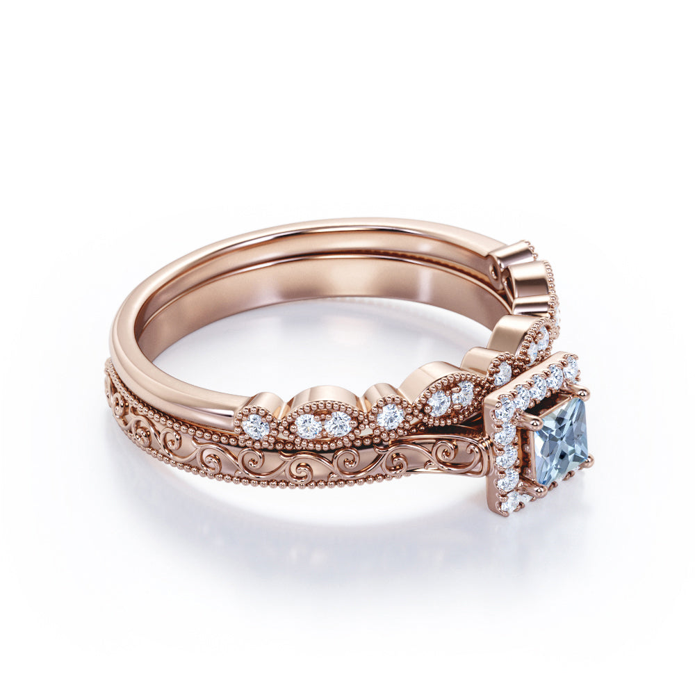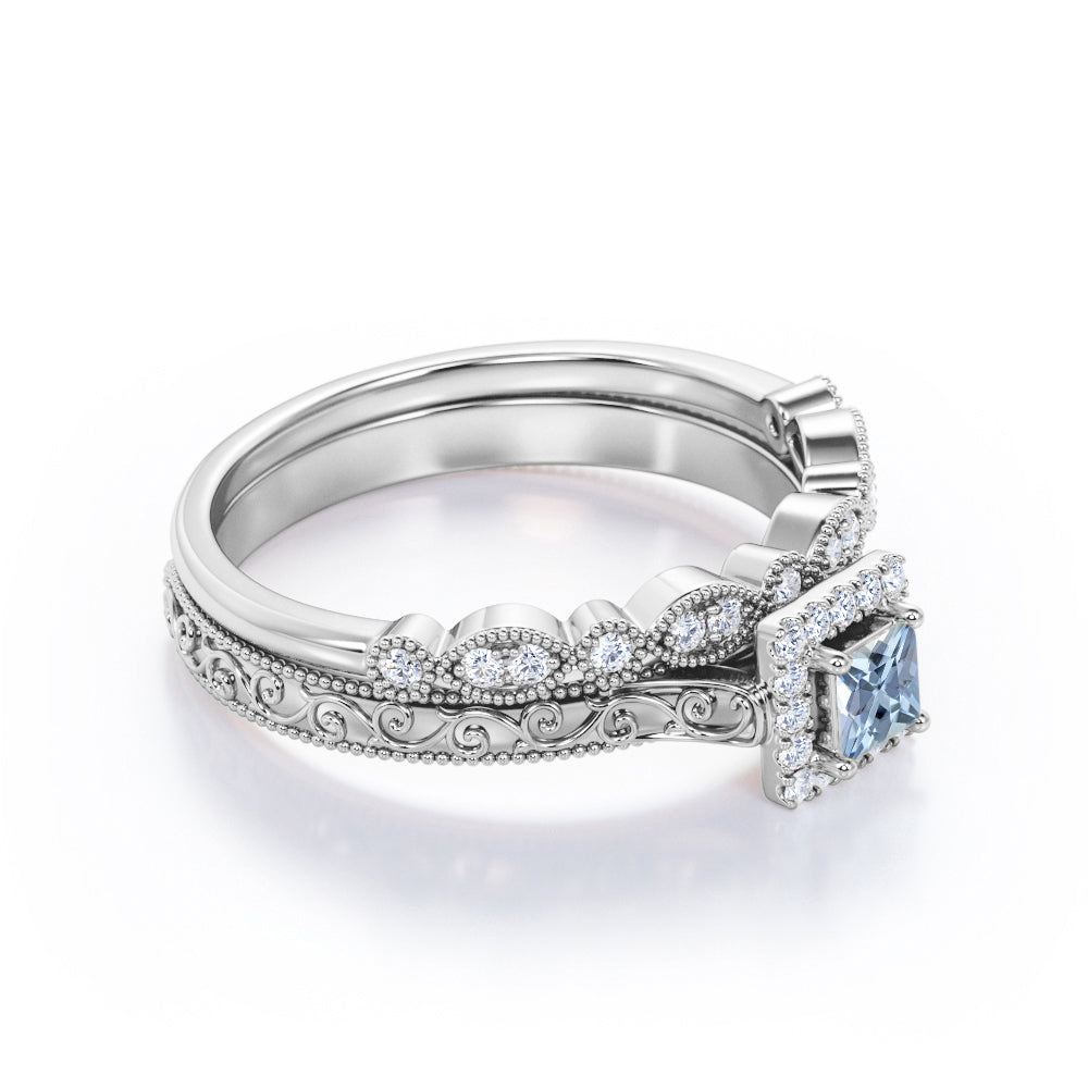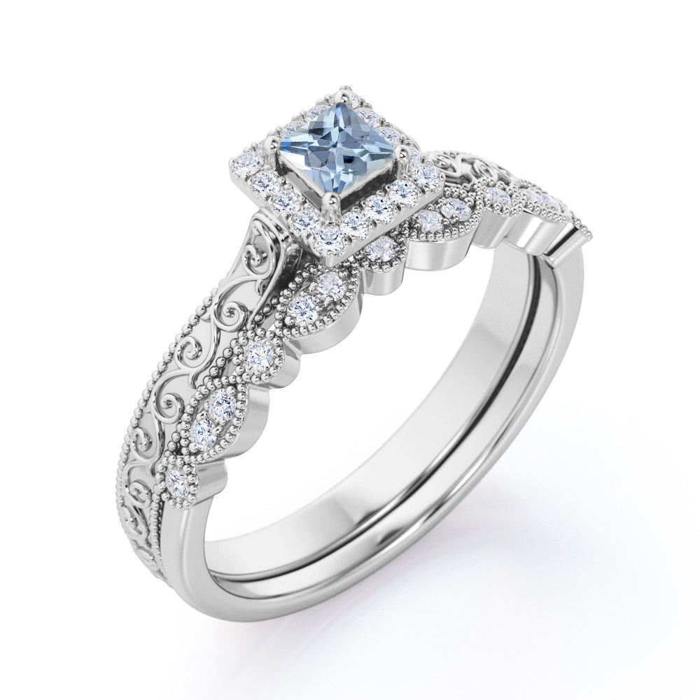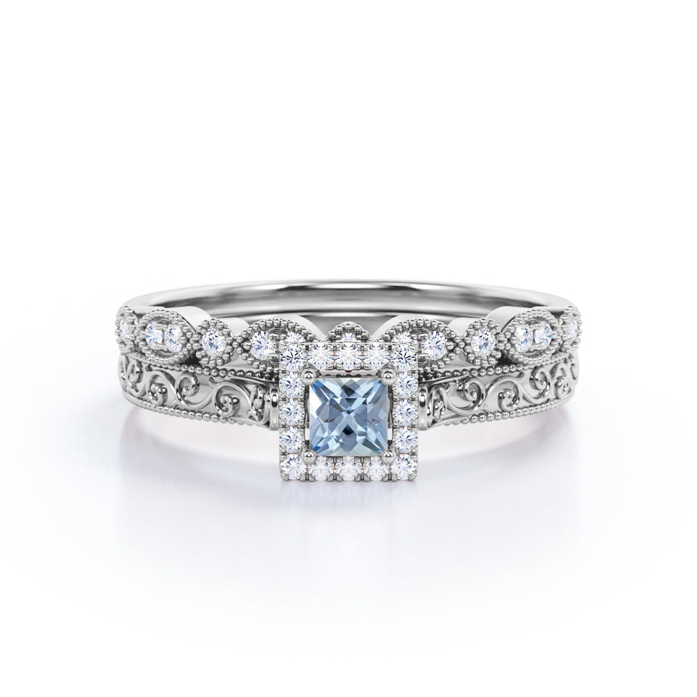 Vintage Filigree 0.6 Carat Princess Cut Aquamarine And Diamond Halo Wedding Ring Set In White Gold