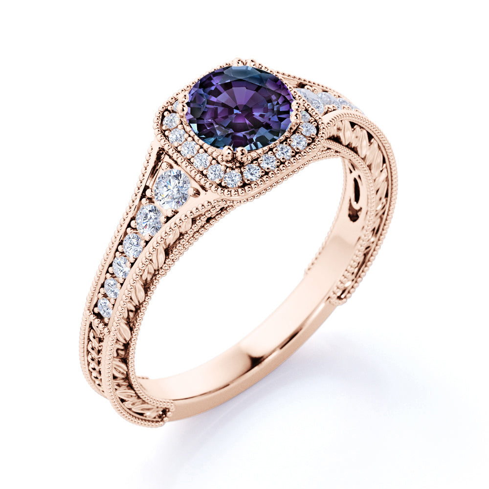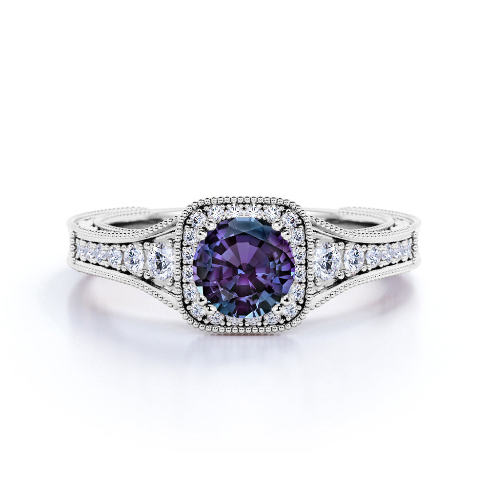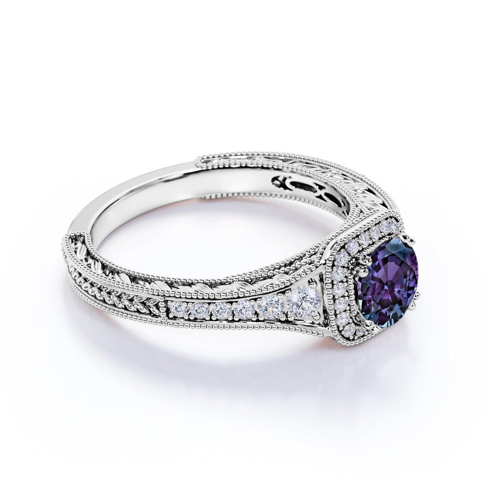 Vintage Filigree 1.35 Carat Round Cut Lab Created Alexandrite And Diamond Eight Prong Halo Engagement Ring In White Gold