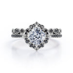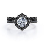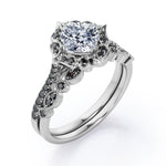 Embellish her finger with this Vintage Filigree Halo - 1.65 TCW Cushion Cut Moissanite with Lab Created Black Diamond - Pave Accented Bridal Ring Set in White gold. Professionally handcrafted into a fine cushion cut by our skilled jewelers, this affordable best moissanite rings set features total 1.65 carat moissanite and lab-created black diamonds. Special and non-traditional, this moissanite stone ring set is well-suited for those who are not quite into normal lifestyle. With naked eyes moissanites look, shine and feel exactly like diamonds. With its splendor, this sterling silver moissanite wedding rings set will enhance happiness and attract positive vibes. This moissanite bridal set is beautiful and accessible since it is available at a reasonable price. Moissanites are the most popular alternative gemstone for diamonds while being at lower and more affordable price. If you are looking for a special gift for your friends or your better half, this moissanite band set, the birthstone ring for the fourth month, symbolizing an unbreakable love and strength, will surely be the best choice. Additionally, this moissanite jewelry can be customized to your own choice of metal colors: White gold, rose gold, yellow gold and black gold in 18k Gold over Silver, 10k and 14k gold metal options. In regards to its hardness, moissanite is almost as hard as diamond which means that it is notably durable. Let’s impress her with this moissanite stone ring set, and she will be eternally joyful.
