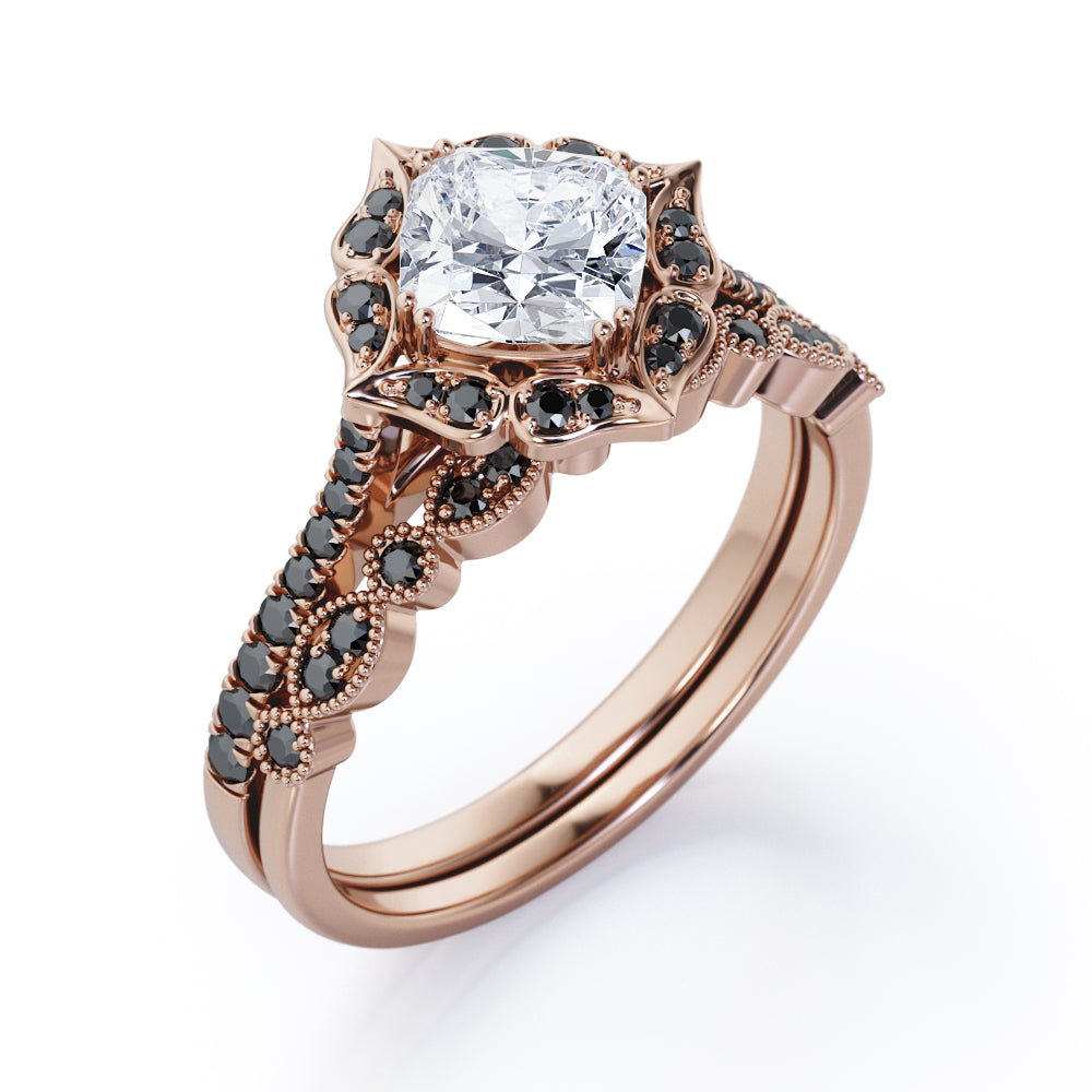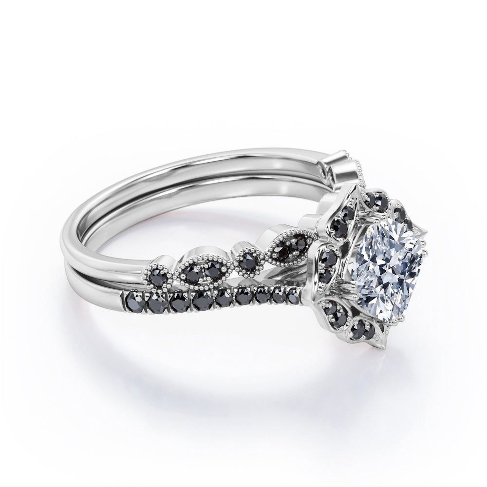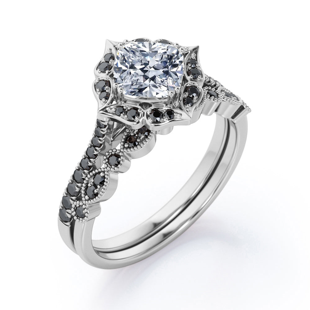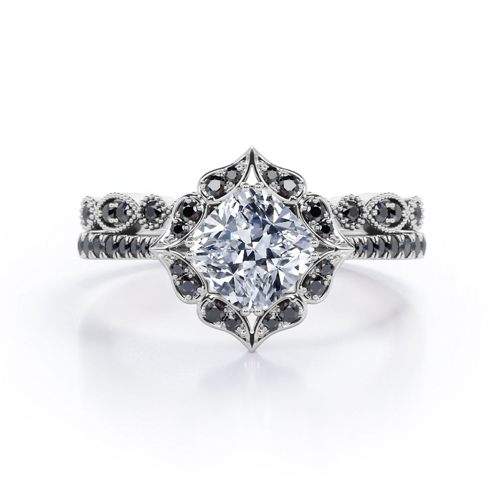 Vintage Filigree Halo - 1.65 TCW Cushion Cut Moissanite with Lab Created Black Diamond - Pave Accented Bridal Ring Set in White Gold