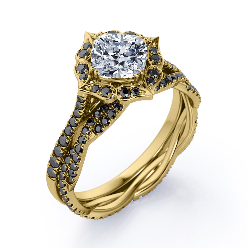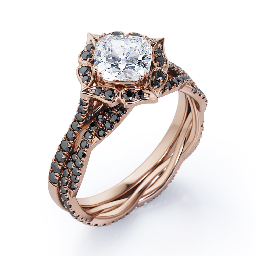 Make every day a cloud nine day with this Vintage Flower Cluster 1.75 TCW Cushion Cut Moissanite with Lab Created Black Diamond Scalloped Pave Bridal Set in Rose gold. Professionally handcrafted into a fine cushion cut by our experts in lapidary, this elegant moissanite promise ring set consists of total 1.75 carat moissanite and lab-created black diamonds. Special and non-traditional, this moissanite silver engagement rings set is well-suited for those who are not quite into normal lifestyle. With naked eyes moissanites look, shine and feel exactly like diamonds. With its glory and clarity, this moissanite wedding set will enhance happiness and attract positive vibes. This near colorless moissanite engagement rings set is beautiful and accessible since it is available at an affordable price. Moissanites are the most popular alternative gemstone for diamonds while being at lower and more affordable price. If you are looking for a special gift for your friends or your better half, this moissanite wedding set, the birthstone ring for the fourth month, symbolizing an unbreakable love and strength, will surely be the best choice. Additionally, this moissanite anniversary band set can be customized, so customers can choose one of metal colors between White gold, rose gold, yellow gold and black gold in 18k Gold over Silver, 10k and 14k gold metal options. In regards to its hardness, moissanite is almost as hard as diamond which means that it is notably durable. Let's fulfill your love story with this moissanite fine jewelry and, surely, she will not regret it.