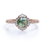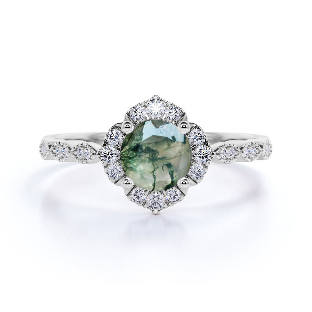 Paint your love story with this Vintage Flower Nature Inspired 1.5 Carat Round Cut Natural Veiny Moss Green Agate and Diamond Halo Art Deco Engagement Ring in White Gold for Her. This floral nature-inspired moss green agate engagement ring features 1 carat round cut natural moss green agate and .5 carat real genuine side diamond for gold ring and moissanite for silver ring. This art deco halo veiny green agate engagement ring can be customized to either 10k, 14K and Gold over Silver and either Black Gold, Rose Gold, White Gold or Yellow Gold. Also, as your satisfaction is our most priority, we will do our best to have your handmade jewelry be carefully and beautifully crafted by our expert jewelers. The order also comes with a 30-day full refund policy. This green colored minerals with banded inclusions ring will surely be a perfect gift for your special someone. It is well-known for spiritual and healing power. Encourage trust and hope with this real green Agate ring that shows a variety of white with green inclusions that resembles moss. Own this ring which displays one of the most unique patterns of color and stand out from the rest. With its long history and many oral traditions around the world, this delicate druzy moss green Agate ring is sure to be eye-catching and bring all eyes on you. It can be customized as per your satisfaction and available in both silver and gold metal. Precisely handcrafted and created to be unique, no two rings are exactly alike. Being named a growth crystal, this real dendritic moss green Agate encourages spiritual growth and renewed commitment to a higher purpose. Impress your special someone with this beautiful and affordable milky white moss green Agate ring. It is the perfect match for those who are looking for a remarkable gemstone rings as moss green Agate embodies their own unique intriguing patterns and uplifting meaning.