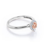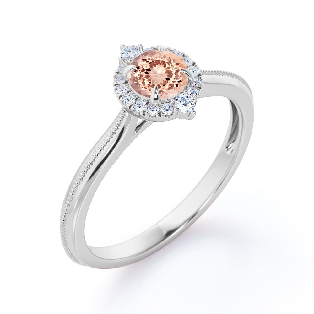 Vintage Halo 0.65 carat Round Morganite and Moissanite Engagement Ring in Rose Gold displays a 0.5 carat round Morganite that is surrounded by a Moissanite halo; the accent is composed by round dainty Moissanite with bigger round Moissanite on top and bottom of the frame. Morganite is believed to be a healing stone for inner-self and body. It is also a zodiac stone so if your beloved one was born under Pisces, Taurus, and Cancer, this might be the perfect gift for them. The band is garnished by bead decoration by half of the band. You can choose either white gold, rose gold, or black gold to be the color of your ring and it comes with 3 metal options; 18k gold over silver, 10k gold and 14k gold.