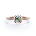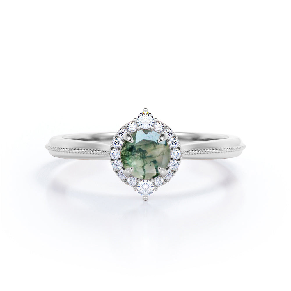 Vintage Halo 0.8 carat Round Moss Agate and Moissanite Anniversary Ring For Her in White Gold