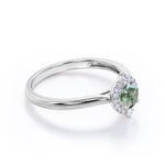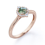 Surprise her with a Vintage Halo 0.8 carat Round Moss Agate and Moissanite Anniversary Ring For Her in White Gold. A 0.5 carat round Moss agate is featured among the 0.3 carat paved Moissanite halo. With two of Moissanite that are bigger than the other, it enlarges the visual of the ring and make it look like the oval shape. The band is well polished and decorated with bead decoration. Milgrain line along the band adds some texture to the ring so it is not too plain. This halo promise ring is available in white gold, rose gold, yellow gold and black gold. You can also decide on the metal; 18k gold over silver, 10k gold, 14k gold and 18k gold are up for you to choose.