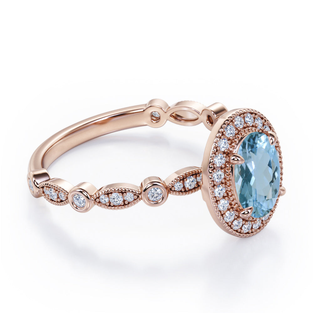 Vintage Halo 1.35 Carat Oval Cut Aquamarine And Diamond Art Deco Engagement Ring In Rose Gold. Get ready to turn some heads with our timeless halo oval cut Aquamarine and diamond engagement ring. A stunning and affordable option, this vintage engagement ring puts on quite the show. The sparkling halo of white diamonds encloses an oval cut 1 carat aquamarine. The ring's shank is adorned with marquise-shaped frames set with tiny diamonds of 0.35 carat for even more bling. Romantic and vintage-inspired, this cluster set art deco style showpiece is handmade with deep love and attention by our well-experienced craftsmen. This vintage halo 1.35 carat oval cut aquamarine and diamond art deco engagement ring in rose gold can also be customized to 18k Gold plating over silver, 10k Gold or 14k Gold as per your choice. Please note that if the ring is made over silver, the side stone will be moissanite and if it is made on gold, diamond will be employed as the side stone.
