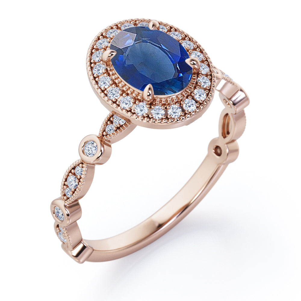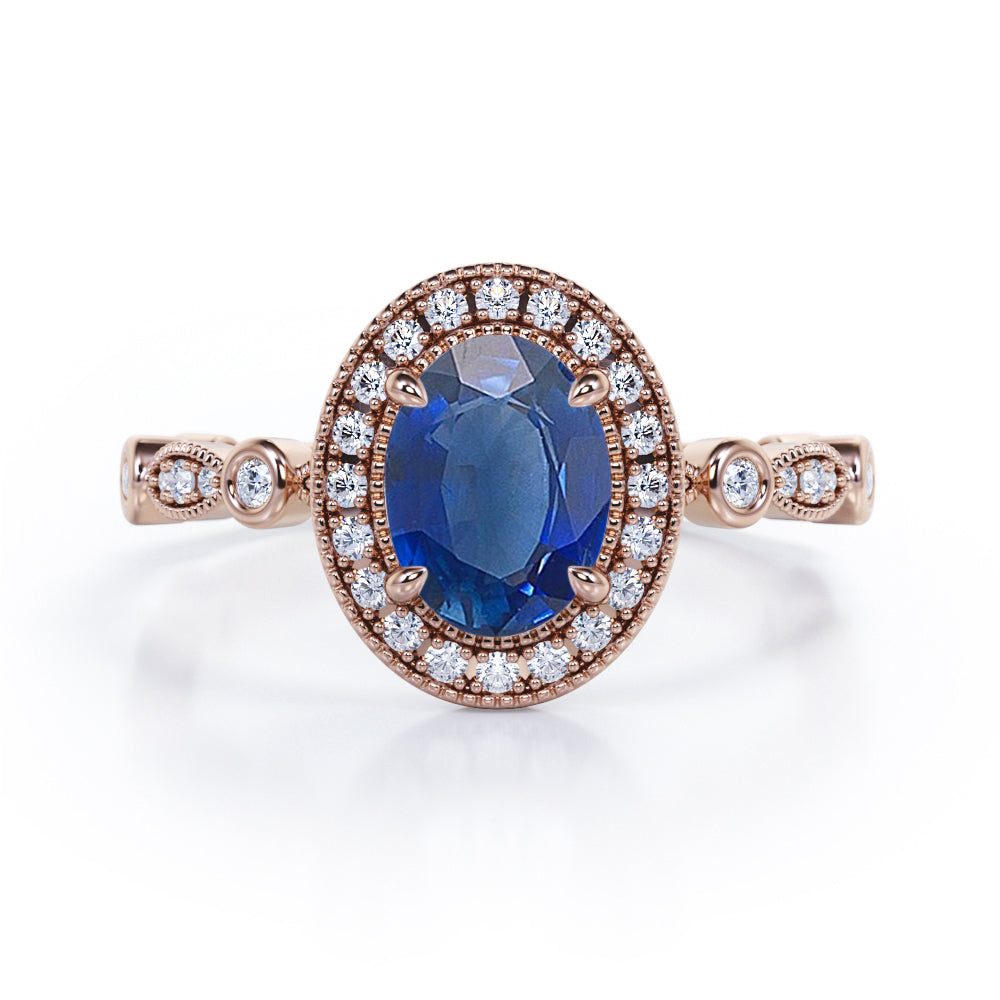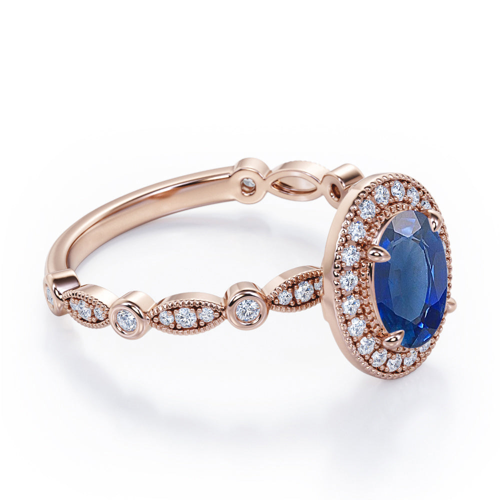 Vintage Halo 1.35 Carat Oval Cut Lab-Created Sapphire And Diamond Art Deco Engagement Ring In Rose Gold. Get ready to turn some heads with our timeless halo oval cut Lab-Created sapphire and diamond engagement ring. A stunning and affordable option, this vintage engagement ring puts on quite the show. The sparkling halo of white diamonds encloses an oval cut Lab-Created sapphire of 1 carat. The ring's shank is adorned with marquise-shaped frames set with tiny diamonds of 0.35 carat for even more bling. Romantic and vintage-inspired, this cluster set art deco style showpiece is handmade with deep love and attention by our well-experienced craftsmen. This vintage halo 1.35 carat oval cut Lab-Created sapphire and diamond art deco engagement ring in rose gold can also be customized to 18k Gold plating over silver, 10k Gold or 14k Gold as per your choice. Please note that if the ring is made over silver, the side stone will be moissanite and if it is made on gold, diamond will be employed as the side stone.