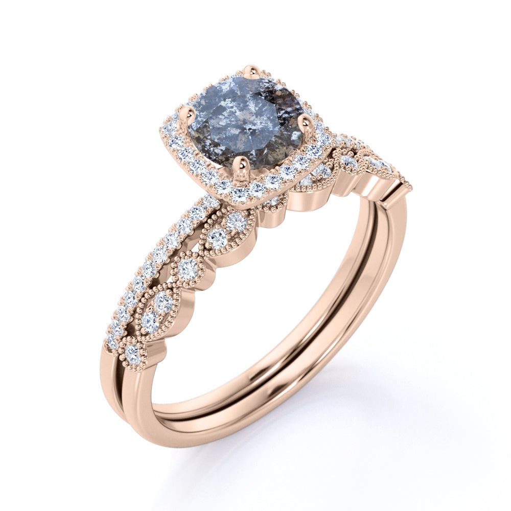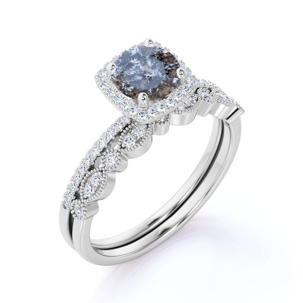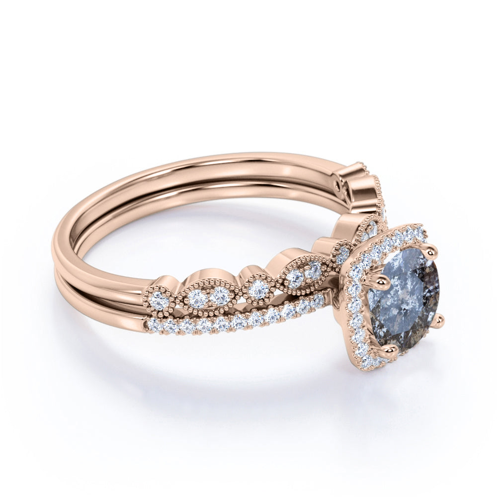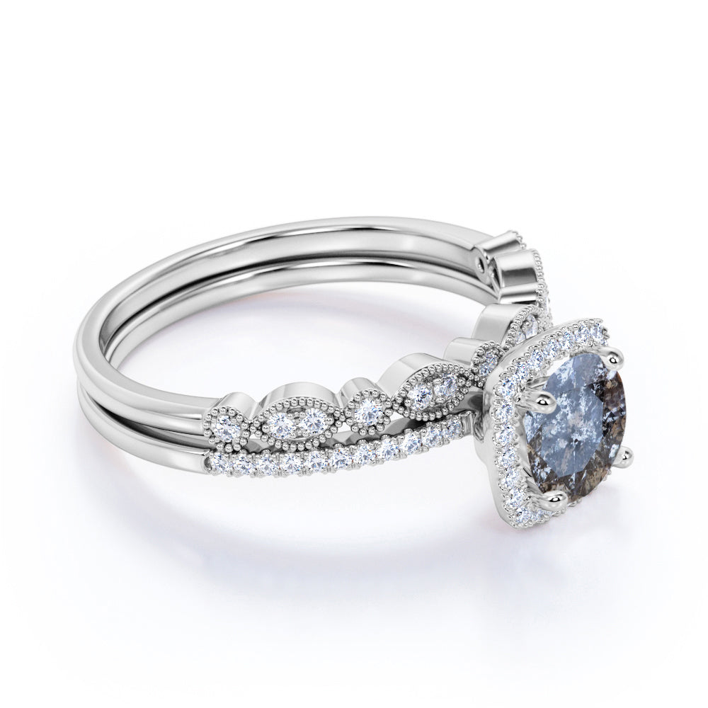 Vintage Halo 1.25 Carat Round Cut Natural Dark Galaxy Grey Salt and Pepper Diamond with Art Deco Marquise Dot Band Wedding Ring Sets