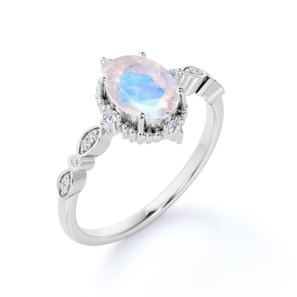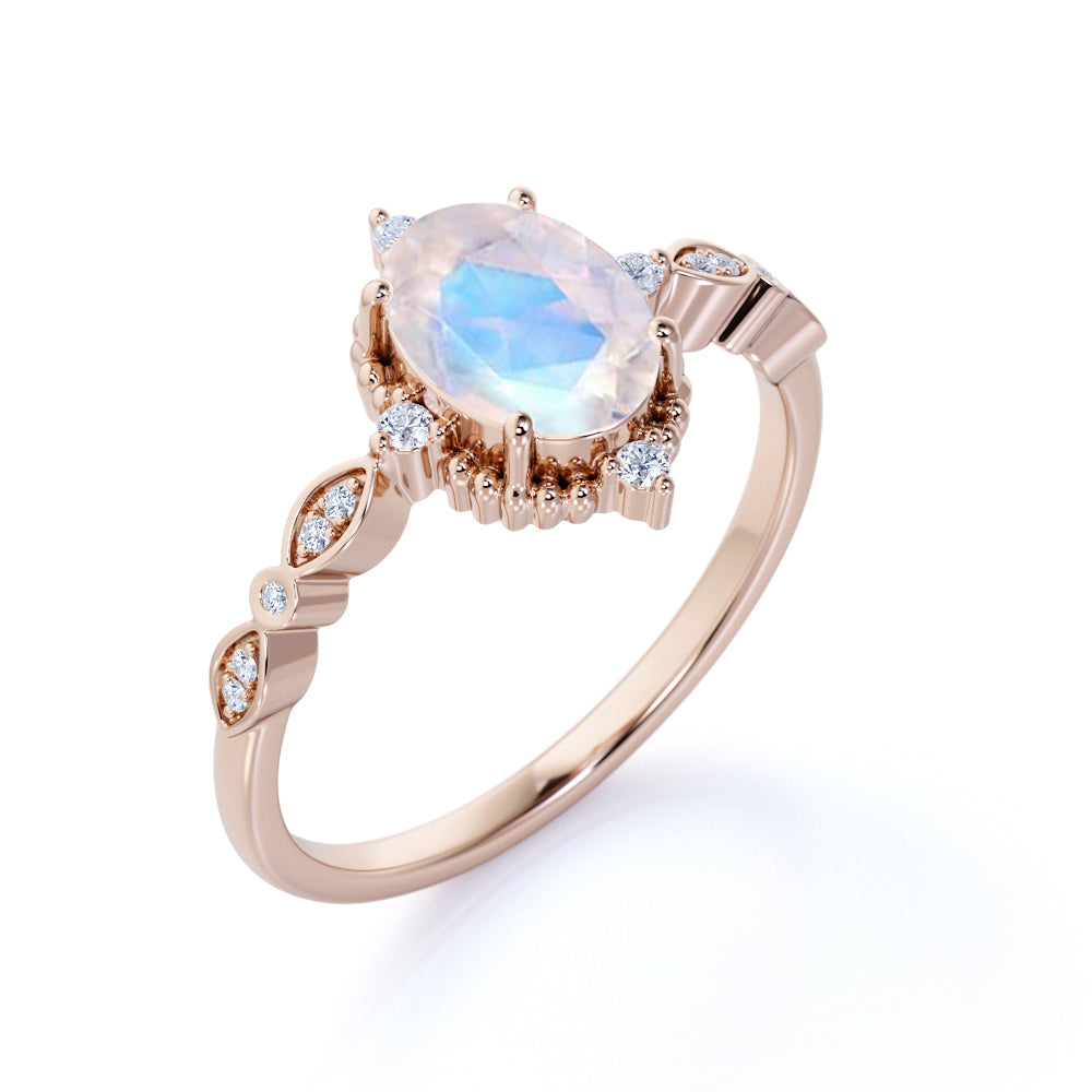 The colorful play of light from this faceted rainbow moonstone and diamond engagement ring will surely put a sparkle in your eyes. This vintage engagement ring features an approximately 1 carat oval cut natural rainbow moonstone in the center of the engagement ring, surrounded by .25 carat real diamonds for gold ring and moissanite for silver ring, for a total weight of 1.25 carats.