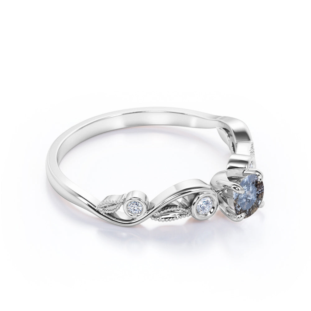 IMPORTANT NOTE: Since each Salt and Pepper Diamonds is one of a kind, the actual color of it may vary from the one that is pictured above. Embellish your love story with the uniqueness of this Vintage Leaf Nature-Inspired .75 Carat Round Cut Natural Fancy Galaxy Grey Salt and Pepper Diamond Bezel Set Milgrain Engagement Ring in White Gold. This nature-inspired leaf design genuine fancy grey Salt and Pepper Diamond engagement ring features .50 carat round cut natural Salt and Pepper Diamond and .25 carat real side diamond for gold ring and moissanite for silver ring. This vintage Milgrain decorated Salt and Pepper engagement ring can be customized to either 10k, 14K and Gold over Silver and either Black Gold, Rose Gold, White Gold or Yellow Gold. Also, as your satisfaction is our most priority, we will do our best to have your handmade jewelry be carefully and beautifully crafted by our expert jewelers. The order also comes with a 30-day full refund policy. Enrich your charm and charisma with this vintage dark grey Salt and Pepper Diamond ring for women that is excellent for everyday wear. With its unique colors and inclusions, this natural grey Salt and Pepper will bring more personal touch to the traditional ring. With no two diamonds exactly alike, Salt and Pepper Diamond gives each ring character and style. If you are searching for some alternate gemstone with unique appearance, this Salt and Pepper Diamond ring will be your right choice. Salt and Pepper Diamonds are eco-friendly, ethical, and environmental friendly. Its inclusions will distinguish your ring offering a unique look on your finger . If you are in search of a unique gift for any occasion, this stunning Salt and Pepper Diamond ring is the best answer for you. Design and create your very own unique Salt and Pepper Diamond ring that makes you outstanding from the rest! Sparkle your finger with this ring which is perfect for any occasion and everyday wear. With its mesmerizing salt and pepper inclusions, it is sure to enchant your special someone with gracefulness.