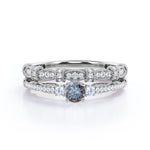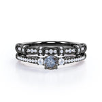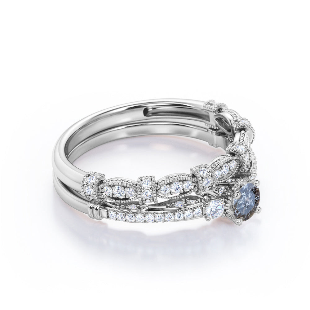 Vintage Milgrain 0.70 Carat Round Cut Genuine Salt and Pepper Three Stone Wedding Ring Set In White Gold. All good things come in threes, and this gloriously intricate piece is no exception. Romantic and vintage-inspired, this three stone wedding ring set features a round cut salt and pepper diamond of 0.33 carat and micro pave set diamonds of 0.32 carat and a matching wedding band. Handmade with deep love and detailed attention, this vintage milgrain 0.65 carat round cut genuine salt and pepper diamond three stone wedding ring set in white gold can also be customized to 18k Gold plating over silver, 10k Gold or 14k Gold as per your choice. Referencing art deco elements, this ring is a whimsical option in white gold. A sweet and endearing touch to a minimalistic design that is bound to exude long-lasting beauty. So what are you waiting for? Press add to your cart button now and make this alluring engagement ring all yours.