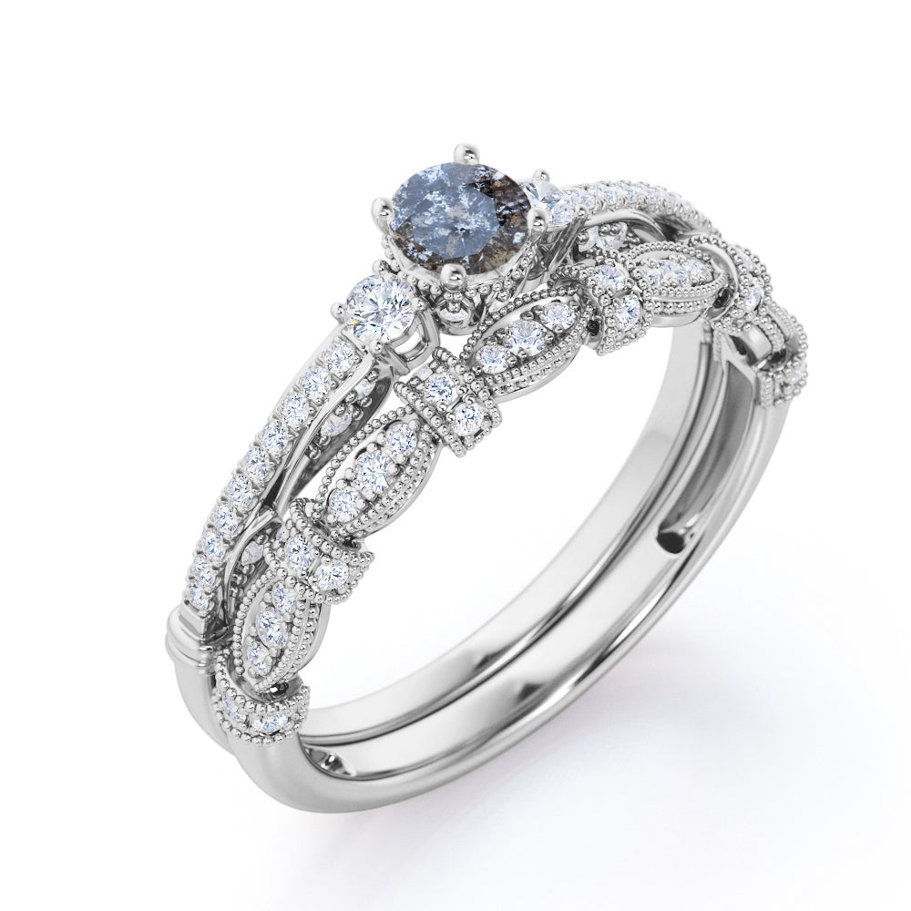 Vintage Milgrain 0.65 Carat Round Cut Genuine Salt and Pepper Diamond Three Stone Wedding Ring Set In White Gold