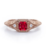 Vintage Milgrain 1.10 Carat Princess Cut Lab Ruby And Diamond Sharp Eight Claws Art Deco Engagement Ring In Rose Gold